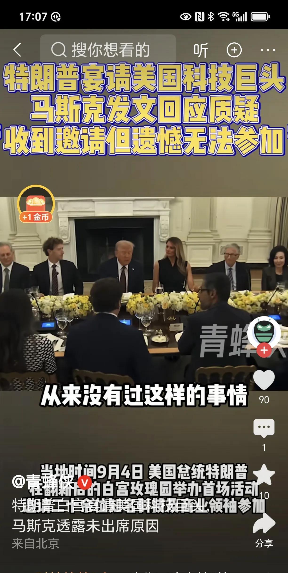 美国总统特朗普宴请科技巨头,前美国效力部长马斯克也在被邀之列。特朗普对这位“老部