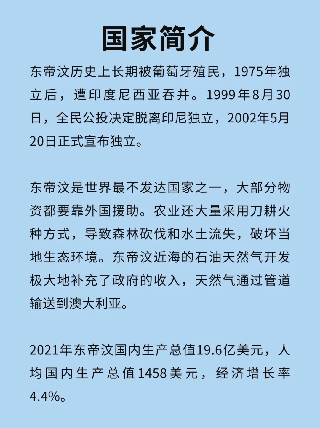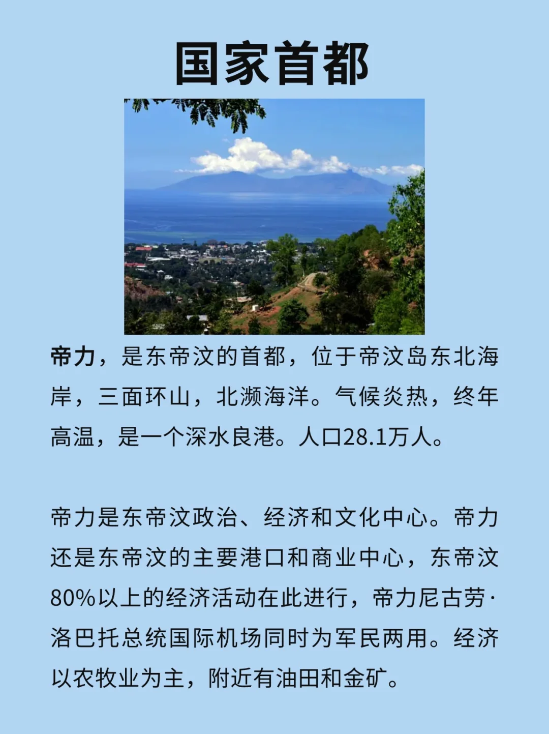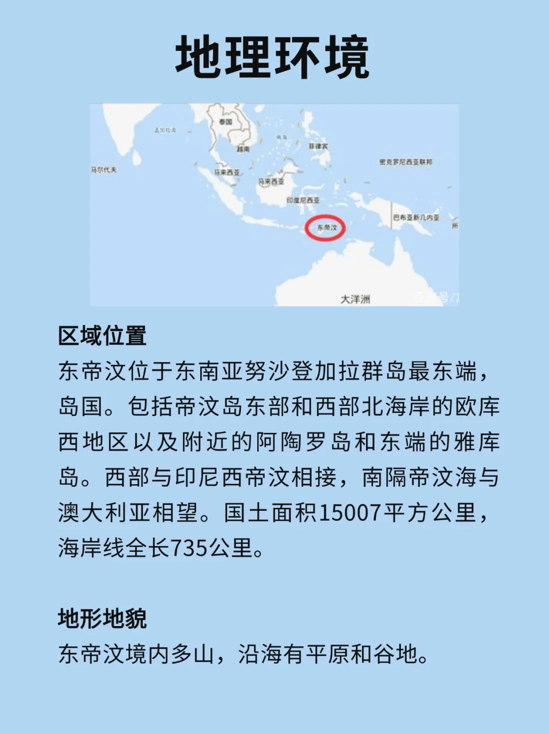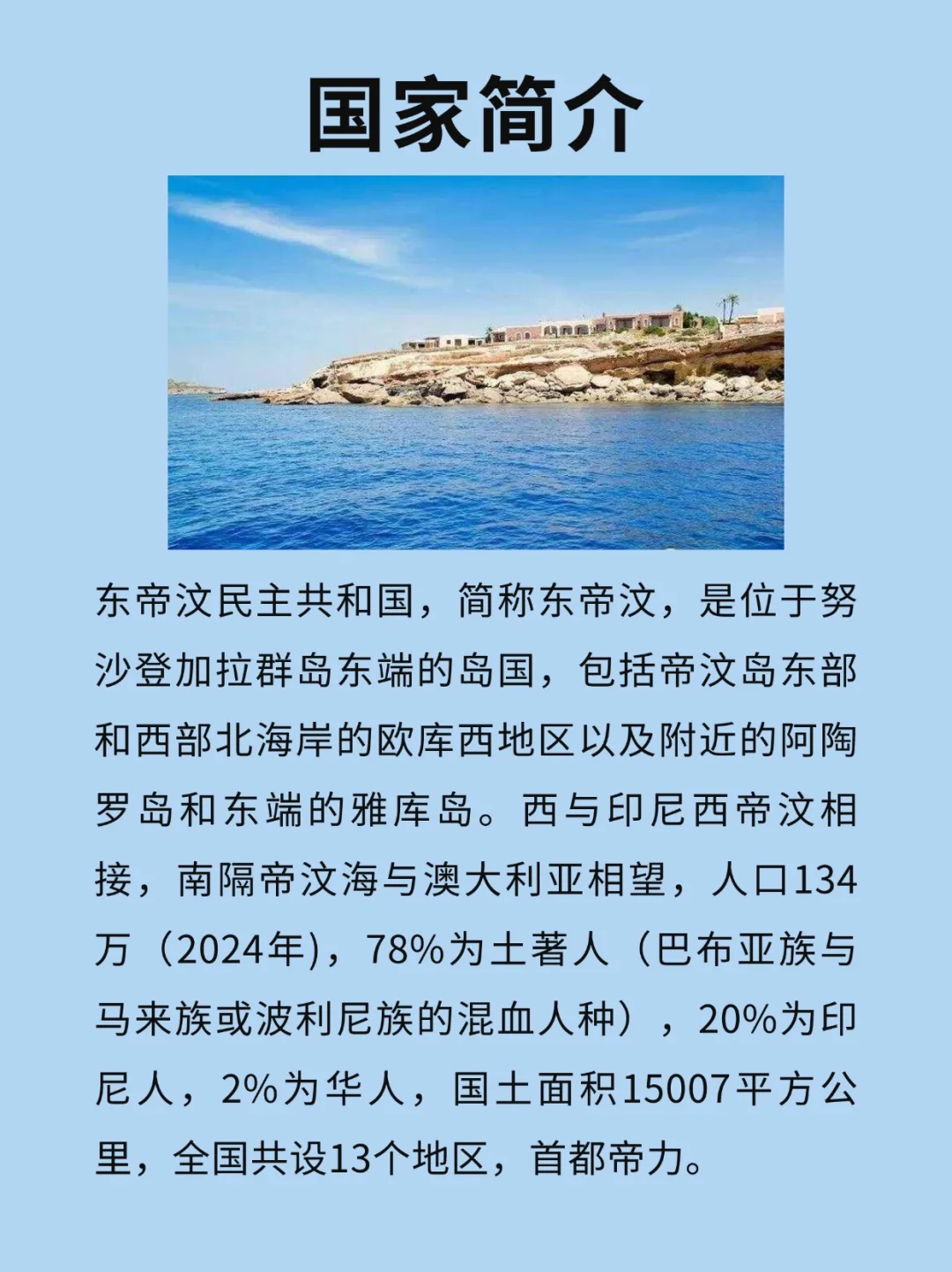 [种草R]西与印尼西帝汶相接,南隔帝汶海与澳大利亚相望,人口134万(2024年),78%为土著人(巴布亚族与马来族或波利尼族的混血人种),20%为印尼人,2%为华人,国土面积15007平方公里,全国共设13个地区,首都帝力。