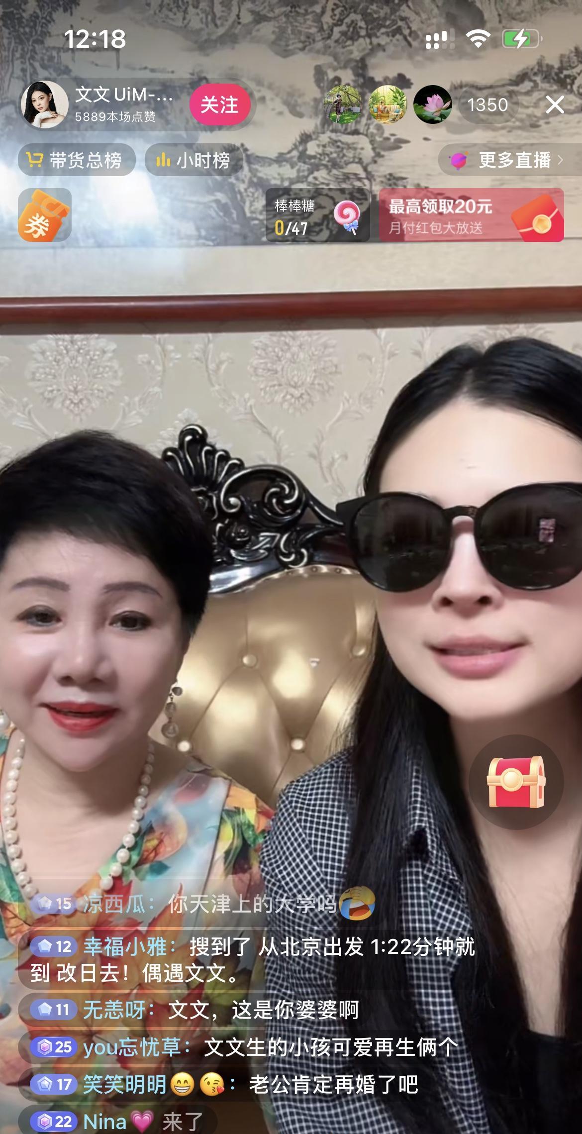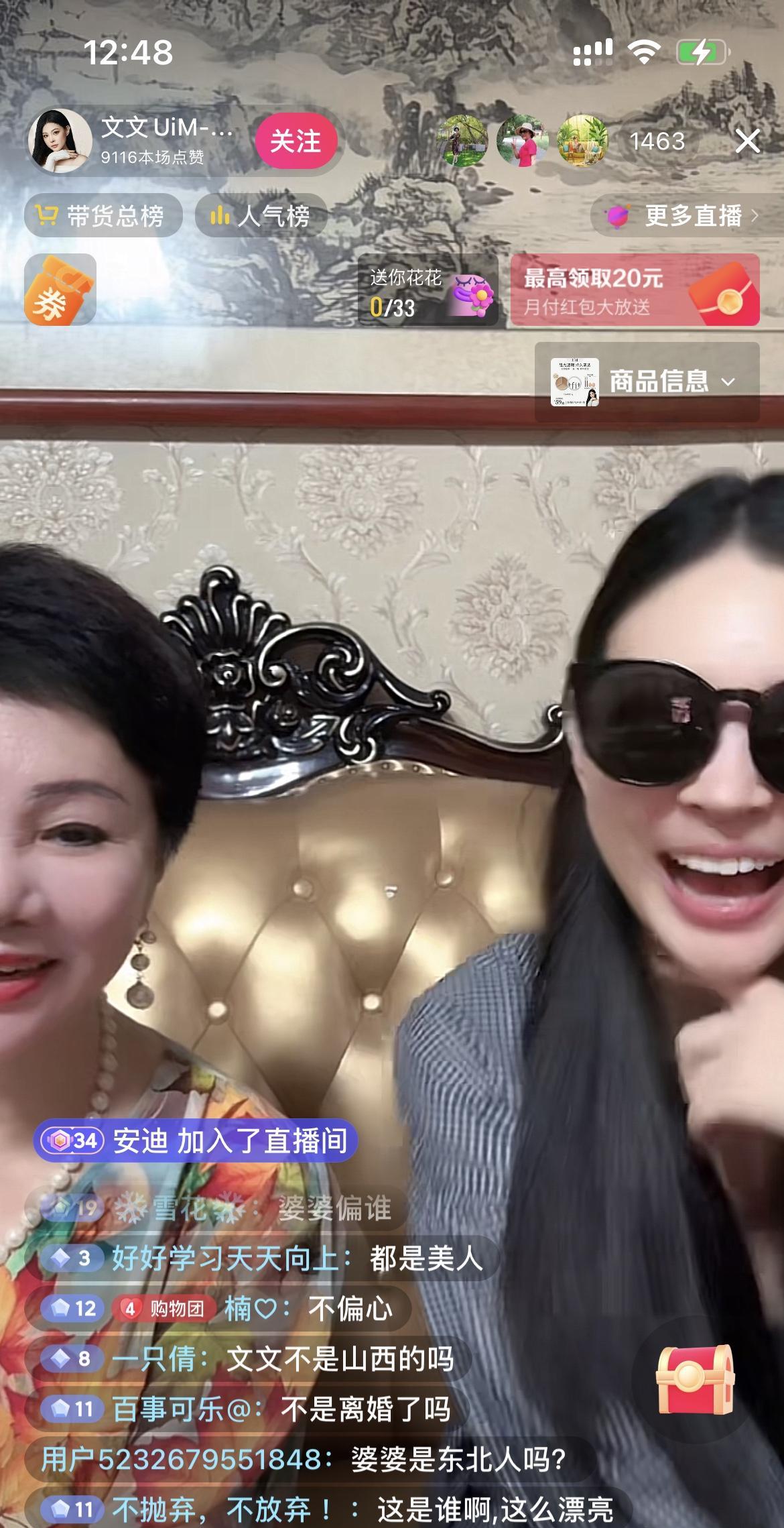 哎呀,文文这是怎么啦? 在直播间还架着一副大墨镜。 直播间里好多人都问她怎么回事,她婆婆说,昨晚上文文和朋友喝酒去了,回来得晚,眼睛肿了,所以才戴着墨镜。 虽说文文离了婚,但她和婆婆的关系还不错,跑到婆婆家跟婆婆一块儿直播。 文文婆婆家在天津蓟县盘山,家里经营着农家院,婆婆能说会道。婆婆帮文文带着六岁多的女儿。文文大学一毕业就结婚生娃,后来离了婚,不过她和婆婆、大姑姐的关系一直挺好。 文文也算是破而后立,找到了新的发展方向,所以直播间里大概有1500人,把她高兴坏了。 她说今年状况好多了,去年压力大得很,老是哭,眼睛一直肿着。如今她自我感觉特别好,婆婆和大姑姐也都支持她。 正所谓塞翁失马,焉知非福,人挪活,文文虽然离开了湛蓝,但依旧是那个漂亮、直爽的人来疯小姑娘。 #晒图笔记大赛#
