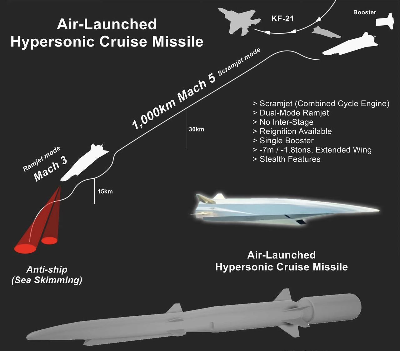 韩国方面突然公布了他们研制的吸气式高超音速弹试飞成功的消息。 该弹采用超燃冲压发动机,二级助推器,前掠式进气道,速度可达6.2马赫,射程1000公里,未来将发展出空射版和舰载版,2030年左右开始量产。