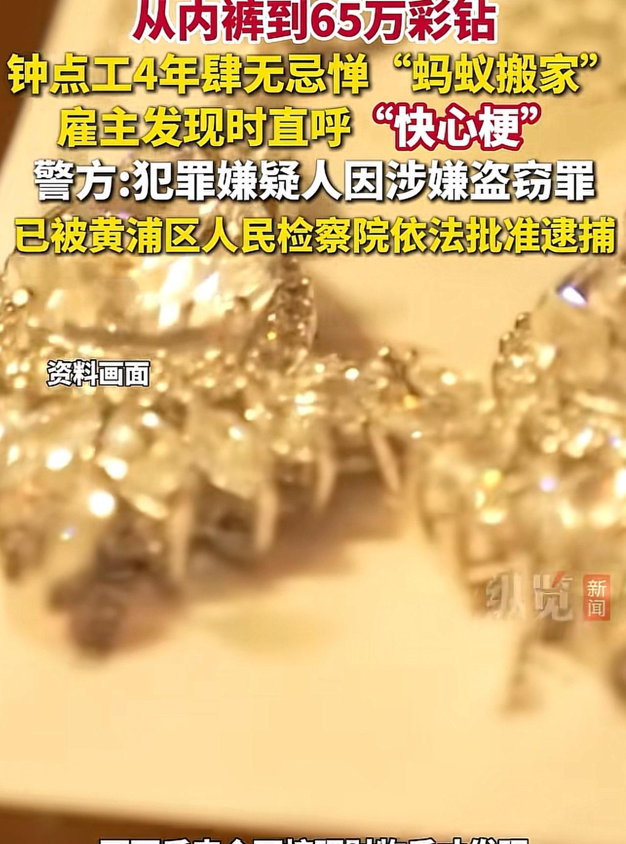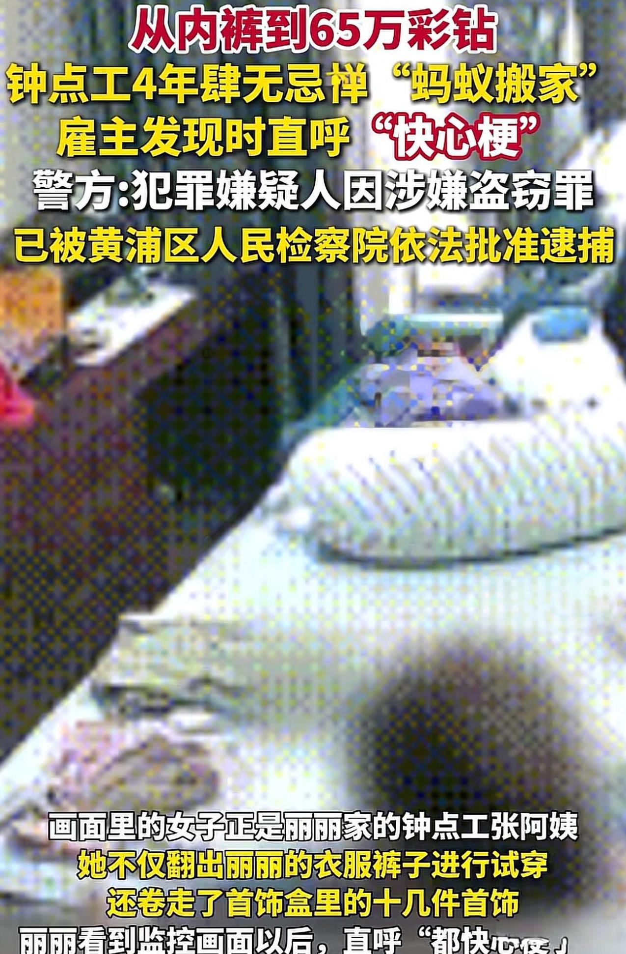 上海,一女子发现家里65万的彩钻不翼而飞,她怀疑是钟点钟阿姨偷的。于是,她偷偷在家里安装了监控器,监控画面里的一幕,差点让女子惊掉下巴,只见阿姨打开她的衣柜,挨个衣服往自己身上硬套!完事后,又顺走了女子10多件首饰。女子坐不住了,报了警。人赃俱获,阿姨承认在女子家工作的6年期间里, 持续盗窃了4年,彩钻已被自己以2万的价格卖到了二手回收店。目前,钟点钟阿姨已被警方以盗窃罪批捕。 据纵览新闻9月5日报道:丽丽没想到自己信任了6年的钟点阿姨,在自己眼皮子底下偷走自己大量值钱物品,甚至连头绳和内衣也不放过,若不是丢了65万的两枚彩钻,自己还蒙在鼓里。 丽丽因工作繁忙,没时间打理家务,便雇了53岁的钟点工张阿姨帮忙打扫卫生。 她性格大大咧咧,不喜欢计较,见张阿姨干活麻利又勤快,这一雇就是6年。 6年间,丽丽没把张阿姨当外人,两人日常相处融洽,家里有闲置物品时,她还会主动送给张阿姨。 可她怎么也没想到,人心隔肚皮。自己待对方如家人,对方却把她家当成“免费超市”,不管是值钱的物件,还是自己喜欢的东西,都悄悄往兜里塞。 丽丽一直秉持“用人不疑,疑人不用”的态度,对张阿姨十分信任,不仅把家里钥匙交给她,自己不在家时,也让张阿姨直接进门打扫。 不过,最早让丽丽起疑心的,是一次偶然发现。那天她看到张阿姨背着自己一个稀有皮料的名牌小包。 这包她自己都没背过几次,怎么会到张阿姨手里?丽丽忍不住问了一句,可张阿姨面不改色,张口就编瞎话,说这是丽丽之前把小包裹在大包里送给她的。 这话漏洞百出,自己送没送东西,丽丽心里清楚。但当时没抓着实锤,她只能暗自存疑,从那以后,再也没给张阿姨送过任何东西。 可疑心一旦生了根,后续的事就越想越不对劲。 丽丽渐渐发现,家里的东西开始接二连三地消失:先是5块自己很宝贝的奢侈品手表,说不见就不见了;接着是项链、耳环、戒指等一堆首饰;好几个名牌包包也莫名没了踪影;甚至连家里的贵价瓷器、精致刀叉,还有她新买的内衣、扎头发的头绳,都时不时少几件。 一开始,丽丽以为是自己记性差,把东西随手放忘了地方,没太往心里去。可后来丢的东西越来越多、越来越杂,她才把怀疑的目光落到了张阿姨身上。 直到今年6月,丽丽发现首饰盒里两枚总价65万元的彩钻不见了。 这下她更确定是张阿姨干的,可空口无凭,要是直接摊牌,张阿姨肯定不会承认,搞不好还会被倒打一耙。 为了弄清真相,丽丽没声张,悄悄在自家隐蔽角落装了监控,就等着抓现行。 结果监控拍的画面,直接让丽丽惊掉了下巴:当天,即便丽丽的儿子还在家,张阿姨也毫不在意,明目张胆地打开丽丽的衣柜,把里面的衣服、裤子一件一件翻出来往自己身上硬套。 因为丽丽比张阿姨瘦,张阿姨呲牙咧嘴硬塞裤子的模样,让丽丽一阵恶心。 更让丽丽崩溃的还在后面,试完衣服,张阿姨径直走到首饰盒前,打开盒子挑挑拣拣,随手就把十几件首饰揣进了兜里。 看到这一幕,丽丽再也坐不住,直接报了警。 警方接到报案后,在丽丽家门口拦下了张阿姨,当场检查她的包,人赃并获,随后将张阿姨带回了警局。 面对讯问,张阿姨交代:自己在丽丽家干了6年,却持续盗窃了4年,不管是丽丽的衣服、首饰还是包包,只要是自己喜欢的,都会偷偷拿走。 她还承认,那两枚价值65万元的彩钻,已经被自己以2万元的价格卖到了二手回收站。 目前,犯罪嫌疑人张某因涉嫌盗窃罪,已被上海黄浦区人民检察院依法批准逮捕。 《刑法》第264条规定:盗窃公私财物,数额较大的,或者多次盗窃、入户盗窃、携带凶器盗窃、扒窃的,处3年以下有期徒刑、拘役或者管制,并处或者单处罚金;数额巨大或者有其他严重情节的,处3年以上10年以下有期徒刑,并处罚金;数额特别巨大或者有其他特别严重情节的,处10年以上有期徒刑或者无期徒刑,并处罚金或者没收财产。 张阿姨以非法占有为目的,多次盗取丽丽的贵重物品,其行为已符合盗窃罪的构成要件,构成盗窃罪。 此外,她的盗窃数额特别巨大,且不说被盗的多块名牌手表、多个名牌包包,单是那两枚价值65万元的彩钻,就已远超“数额特别巨大”的量刑标准。 结合法律规定,等待她的最低刑罚将是10年有期徒刑。