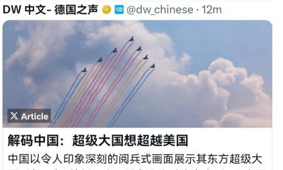 是我们的阅兵式刺激到德国了?德国媒体直接下了一个大标题称,解码中国:超级大国想超越美国!9月3日,德国之声刊文声称,中国以令人印象深刻的阅兵式画面展示其东方超级大国形象,德媒称,中国的信号很明确:在未来的世界秩序中,中国想要制定规则。 德国之声一篇题为“解码中国:超级大国想超越美国”的报道,将中国刚刚结束的阅兵式推向了国际舆论的焦点。 这篇报道里,德媒用“令人印象深刻”形容阅兵画面,直言中国正通过这样的方式展示“东方超级大国”的形象,还明确指出中国传递的信号很清晰:要在未来的世界秩序中参与规则制定,这一论断不仅引发了西方媒体的连锁讨论,也让全球再次聚焦中国发展与国际格局的互动关系。 其实,大国通过重要仪式展示发展成果并非新鲜事。 2018年俄罗斯红场阅兵中,“先锋”高超音速导弹的亮相,也曾被解读为对国际安全格局的战略表态。 中国此次阅兵同样如此,从东风-5C洲际导弹、巨浪-3潜射导弹到新型反无人机系统,一大批自主研发的装备集中亮相,既有战略威慑力量,也有应对新兴战场的前沿装备,这些硬实力的展示,成了德媒解读中国“超级大国”定位的直接依据。 更值得关注的是,德媒的这一判断并非孤立声音。 随后几天,《南德意志报》《图片报》等多家德国媒体跟进报道,只是视角各有不同。 有的聚焦中国军力从“规模型”向“质量型”的转变,有的则将中国阅兵式上“站在历史正确一边”的表述曲解为“权力宣言”。 这种多元甚至分裂的解读,恰恰反映了西方社会对中国崛起的复杂心态——既不得不承认中国发展的现实,又难以摆脱传统霸权思维下的偏见。 从经济层面看,德媒的“超越论”并非空穴来风,其援引的咨询公司数据显示,中国最快5年、最晚15年可能成为全球最大经济体,这一判断背后是中国经济的持续韧性。 2023年,中国对全球经济增长的贡献率超过30%,“一带一路”倡议下累计合作项目突破3000个,从东南亚的基础设施建设到非洲的产能合作,中国的经济合作模式正在获得越来越多国家的认可。 相比之下,美国近年来推行的贸易保护主义政策,反而让其在全球供应链中的影响力受到削弱,这种对比让德媒对中美经济格局的变化更为敏感。 军事领域的展示则进一步强化了德媒的判断,此次阅兵中,高超音速导弹、新一代反舰导弹等装备的亮相,显示中国在前沿军事科技领域的追赶速度。 德媒注意到,中国军队不再单纯追求规模扩张,而是更注重信息化、智能化建设,比如无人机与电子战装备的协同展示,就体现了对新兴战场模式的适应。 不过需要明确的是,中国军力发展始终服务于防御性国防政策,亚丁湾护航、国际维和等行动早已证明,中国军队是维护全球安全的建设性力量,而非某些媒体渲染的“威胁”。 对于“制定规则”的解读,其实存在明显偏差,中国倡导的是基于联合国宪章的国际规则体系,是对多边主义的维护,而非推倒重来。 从G20杭州峰会推动的全球经济治理改革,到进博会展现的开放决心,中国始终在以实际行动推动国际秩序更加公平合理。 德媒将其解读为“想制定规则”,本质上是将西方霸权逻辑套用到中国身上,忽视了中国“共商共建共享”的全球治理理念。 这种误读在西方媒体中并不少见,但也有理性声音对此提出批评。 欧洲布鲁盖尔研究所就指出,部分德国媒体的报道过于片面,应该正视中国在气候合作、全球供应链稳定等领域的积极作用。 事实上,中国阅兵后不久,阿根廷、埃及等国就与中国签署了国防科技合作备忘录,合作领域集中在非致命性装备、军事人才培训等方面,这恰恰说明中国的军事合作始终坚持和平属性,与“霸权扩张”毫无关联。 总体来看,德国媒体的报道既是对中国发展现实的客观反映,也夹杂着传统思维下的偏见。 中国的崛起不是要取代谁,更不是要颠覆现有国际秩序,而是要为全球治理提供更多可能性。 未来,中国需要通过更丰富的民间交流、智库对话等方式,让国际社会更全面地了解自己,同时也需要以持续的实践证明,中国的发展是世界的机遇,而非挑战。 只有打破偏见、增进理解,才能构建更加稳定的全球伙伴关系。 感谢各位看官老爷们选择阅读了此文,这说明是对我水平的认可,麻烦您点一下关注,既方便您进行讨论和分享,又能给带来不一样的参与感,再次感谢各位看官老爷们的支持!