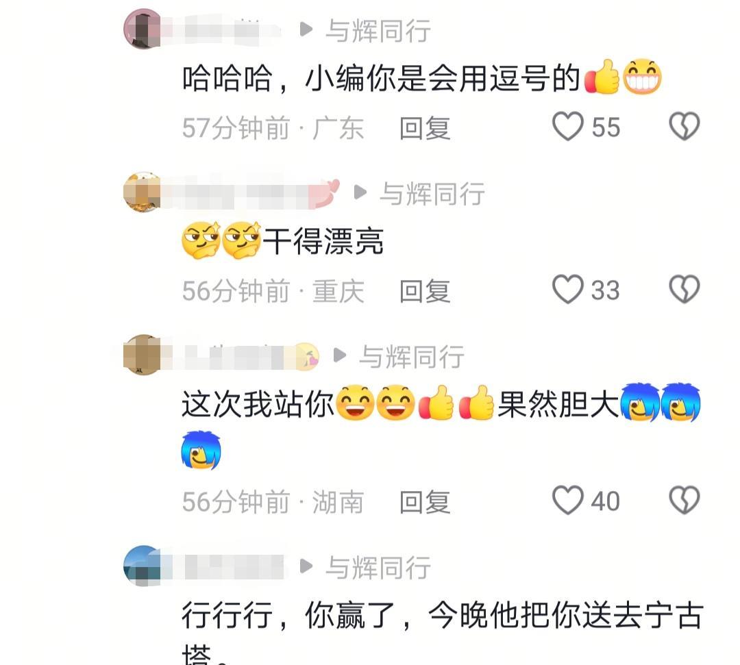 可能董宇辉也没想到,原来那个逗号是这么用的,直接破防。 彪哥提着40米的大刀赶来:“小编,不是说不剪吗?” 小编:“不,剪啊!” 网友们憋着笑,纷纷为小编发声,没毛病,干得漂亮! 这次我们站你,理解到位,视频剪得贼溜,评论区笑不停。 他要是把你发配去宁古塔,我们就为你声援,最少车票给报了,谁怕谁?七天出来又是一条好汉,到时候继续。 #董宇辉#