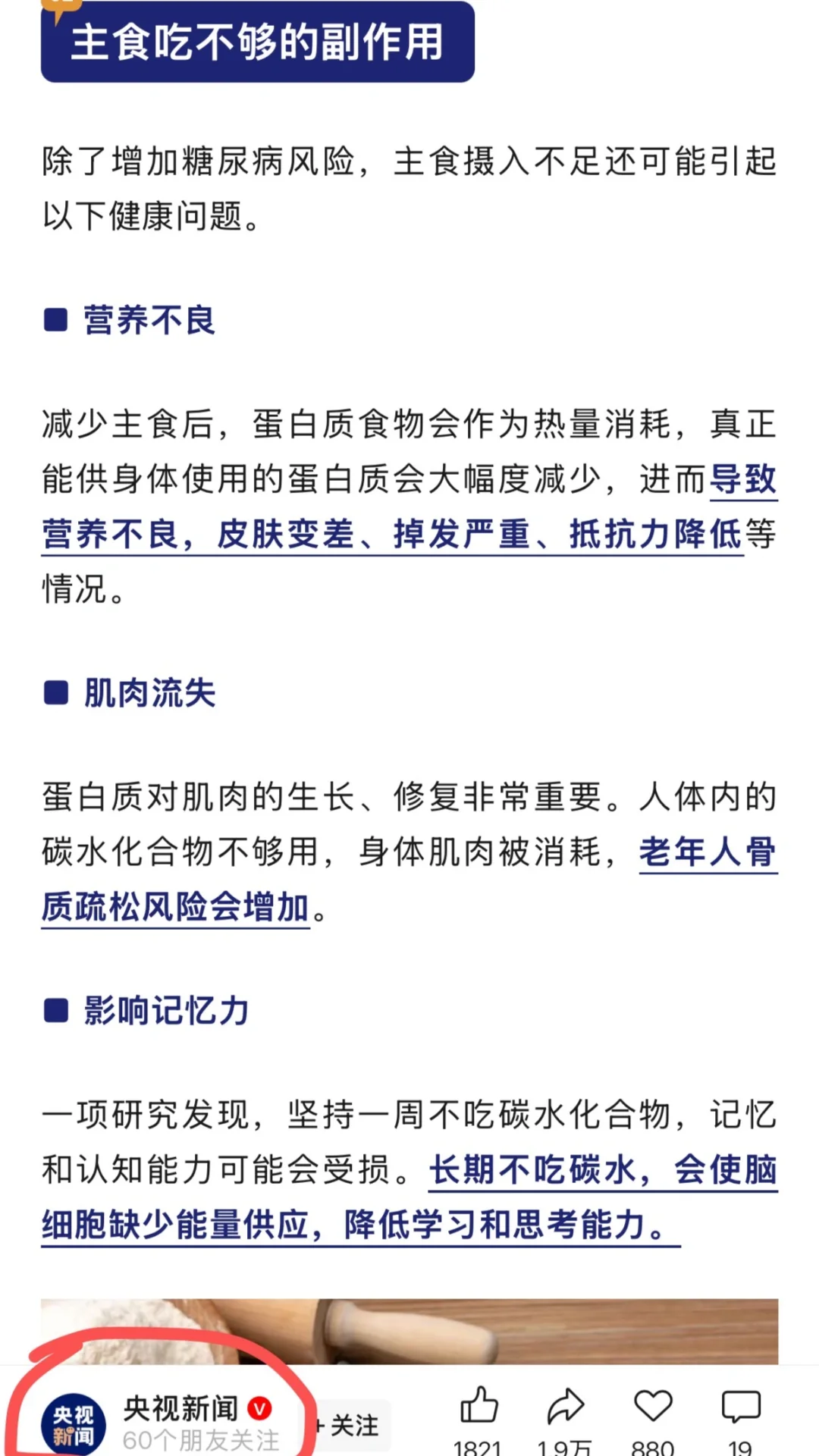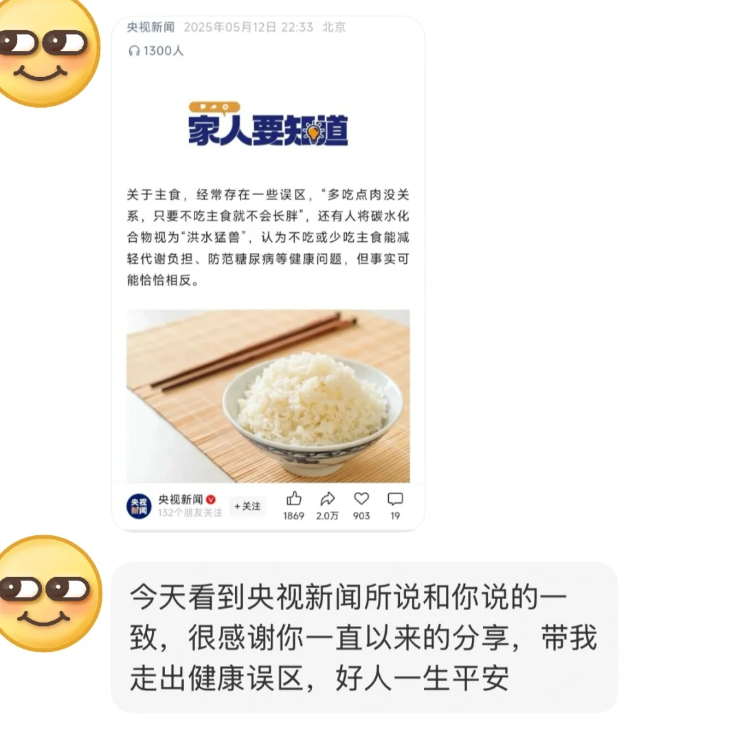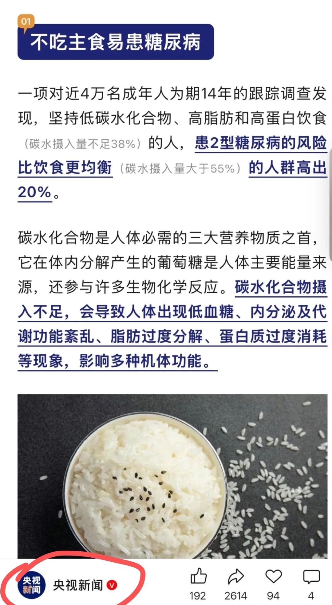 从昨天到今天,我收到好几位老粉儿的提醒,央视新闻、朝闻天下都在为主食正名了,央视新闻的公号也发布了“主食太少易患糖尿病”的文章。 央视都出手了,从侧面可以看出,可能现在被低碳生酮误导而起病的国人越来越多了,引起国家重视了。否则卫健委也不会在去年的新闻发布会上,点名低碳生酮、断碳、节食、轻断食不可取,也不会去年发布各种人群食养指南后,今年又通过各官媒教国人中碳结构减肥配餐。 真相面前,妖风终将停止,迷雾终将散去! 官媒的这波操作也算还我清白了,我这些年所言所说对得起天地良心!