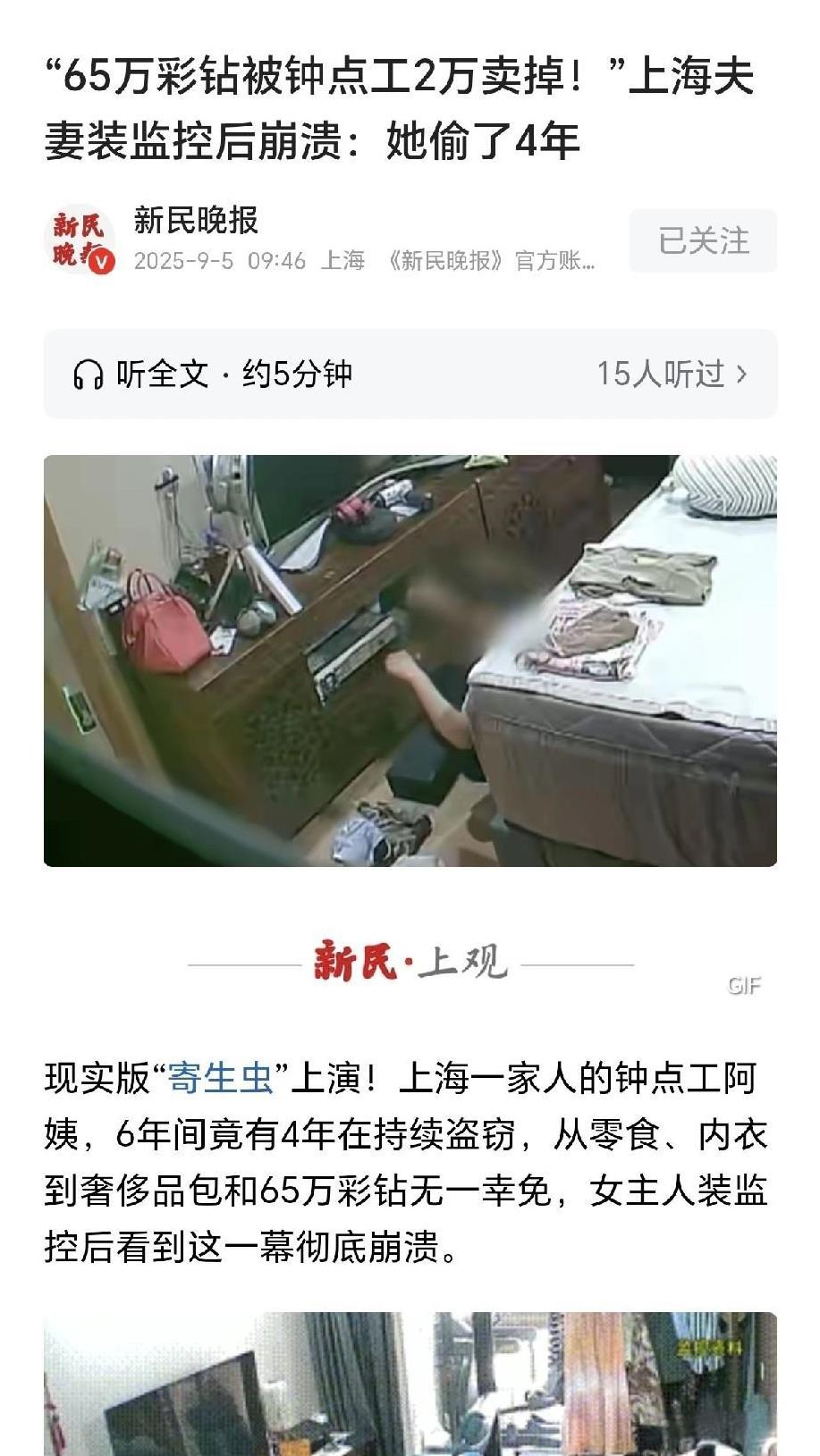 上海,一女子雇佣了两个钟点工阿姨,用了6年,对她们十分信任,可最近一年,家里总丢东西,刚买了2斤巧克力,很快没了,新买了20条裤头,不见了六七条,5个奢侈品手表、名牌小包,瓷器刀叉,两颗价值65万的钻戒全都不见了,女子报警,又在卧室隐蔽处安装了摄像头,监控画面里显示,一个钟点工来到卧室,打开衣柜,试穿女子衣服,试完之后,阿姨做了个动作,女子一看,立刻要心梗了! 丽丽奋斗了半生,挣下不少值钱的东西,她生活富裕,是她应该得的。 可每天时间就那么多,顾了工作就顾不了家庭,实在没法,丽丽就雇佣了了个钟点工阿姨。 两位阿姨做事利索,丽丽用的顺手,对她们的服务十分满意。 可最近一年多,丽丽发现有些不对了,她刚买了一公斤巧克力,很快就吃完了,丽丽问了老公儿子,人家俩压根没吃,丽丽诧异,问了阿姨,俩人都不承认自己吃过。 丽丽没有计较,毕竟只是小事,可是很快发现,她才买了20条裤头,竟然少了六七条! 丽丽琢磨了半天,不至于连裤头都要偷吧,她还是没有多想,以为是自己记错了。 后来她又发现,早上来干活的张阿姨竟然背着自己的名牌小包! 丽丽一问,张阿姨告诉她说,丽丽曾经送给她一个大包,这个小包在大包里套着,她以为也是送给她了,所以她背着小包,没什么问题。 丽丽一想,确有其事,十有八九就是自己记错了,丽丽大条,懒得多想,谁知因为她的疏忽,小祸酿出了大祸。 一直到2025年6月28日,上午时候,丽丽要带家人去拍亲子照,她拿出首饰盒想带上钻戒,那两枚彩钻价值65万,光彩夺目,别提多么奢华美丽。 可她万万没有想到,彩钻竟然不翼而飞,丽丽翻箱倒柜,一上午也没找见。 丽丽惊慌失措,立刻报警,彩钻她很少带,只是在去年时候,朋友要看,她拿出来给朋友拍了张照片。 警方发现,丽丽家住7楼,不可能有人冒险爬进去偷盗,丽丽家门锁完好,也没一点被盗的痕迹。 这就证明,作案人是熟人,出了一家三口都有钥匙,另外两个钟点工都有钥匙。 警方对两个钟点工展开调查,其中:张阿姨,2019年1月雇佣,每天早上6点上门,一周6次,每次4小时,负责丽丽儿子的起居和打扫卫生。 朱阿姨,2019年3月雇佣,每天下午3点上门,一周7次,每次3小时,负责晚饭烹制。 警方又发现,有个首饰店老板经常给张阿姨转钱,而丽丽家丢失这么多的东西,像是被人蚂蚁搬家,慢慢的偷走,一次只被偷走几件。 丽丽立刻把家里的东西检查了一遍,这才发现,她损失巨大,除了那两枚彩钻,还有5块奢侈品名表,名牌包包,值钱的瓷器刀叉,还有多件首饰。 她满心的愤怒,非要查出来到底谁是这个盗贼! 她立刻行动,在家里隐蔽处装上监控。 果不其然,丽丽很快就在监控里发现,张阿姨早上来到家里,径直走进卧室,丽丽儿子还在隔壁,张阿姨竟然毫无顾忌。 她拉开衣橱,试穿丽丽的衣服,她试穿一条裤子,半天穿不上去。 她放下衣服,又去拉开了电视柜子,她拿出丽丽的首饰盒,拿出首饰在自己身上试试,之后,她打包拿走了十几件首饰。 丽丽看的目瞪口呆,觉得自己快要心梗了,没想到自己的隐忍换来这样的变本加厉! 警方立刻行动,在丽丽家楼下拦住了刚下班的张某,果然,在张某包里发现十几件首饰和一件黑色内衣。 张某53岁,面对铁证,她如实交代。 原来,张某来到丽丽家里,看到家里那么多的东西,她心生贪念,觉得拿走几件,应该不会被丽丽发现。 从此后她只要看见喜欢的,她就拿走,无论是包包首饰,她都拿走自己使用,等她用的不喜欢了,她就倒手一卖。 张某在丽丽家干了6年,偷了4年,数十件赃物被她卖了10万余元,钱都被她拿去花掉,她还买了一部分黄金。 回收店老板也被抓获,他花了2万元就收走了那两枚价值65万的彩钻。 目前,张阿姨涉嫌盗窃罪、回收店老板黄某涉嫌掩饰隐瞒犯罪所得罪,二人已被依法逮捕,天网恢恢,等待他们的将是法律的审判。 《刑法》第264条规定: 以非法占有为目的,秘密窃取公私财物,数额较大的,或者多次盗窃、入户盗窃、携带凶 器盗窃、扒窃的,构成盗窃罪 。 张某利用工作便利,多次在雇主家秘密窃取财物,包括巧克力、内裤、名牌包、首饰、手表等,属于“多次盗窃”与“入户盗窃”。 赃物已明确包括两枚价值约65万元的钻戒及多件贵重物品,达到“数额较大”标准,并符合多次盗窃加重情节 。 《刑法》第312条第1款规定: 明知是犯罪所得及其产生的收益而予以窝藏、转移、收购、代为销售或者以其他方法掩饰、隐瞒的,构成掩饰隐瞒犯罪所得罪。 黄某明知贵重物品来源可疑,仍然以明显低于市场价收购涉案赃物,属于“收购”与“掩饰、隐瞒”行为 。 因此,张某和黄某分别以涉嫌盗窃罪和掩饰隐瞒犯罪所得罪被警方逮捕,等待他们最后的审判! 对此,你怎么看? 关注@王哥说法 #头号创作者激励计划#