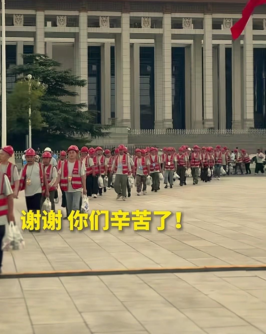 “火到人民日报了!”北京,观礼阅兵仪式结束,最后一个队伍却刚刚入场,他们是一群穿着橙色衣服的工人逆行者,没有鲜花,没有掌声,更没有万人瞩目,他们默默开始了收尾工作。 9月3日中午11时,盛大的仪式结束,观礼的人群纷纷走出街道,可迎面却走来一队并不整齐的队伍,行走在人群中格外突兀,成了另外一道风景线。 他们头戴安全帽,每人手里提着一个袋子,还有的拖着手推车,里面装的是木架子,他们就是这次观礼幕后的拆装工人们。 有记者怎么也没想到,行动会这么快,赶紧追过去,询问:“你们是要赶过去拆东西吗?那您今天要忙到晚上吧?” 一位工人指着前面笑呵呵道:“对,就是观礼台那里,5点之前要拆完。” 记者又看了一眼时间,关心了一句:“时间这么紧张,现在都11点半了,吃饭了吗?” 没想到,工人却笑了笑:“还没有吃。”随后指了指远处干活的地方,“饿了在那边吃一口。” 直到此时记者才注意到,原来他们每个人身上的袋子里,竟然是自己带过来的午饭。 看了视频,有网友感动的说:感谢为这次阅兵默默付出的人,你们是这时代最可爱的人。 也有网友说:每一个岗位都很重要,每一个岗位都值得被尊敬,辛苦了。 开幕式前是他们组装,结束后,是他们赶过来拆除。后勤保障,默默付出。我们很少看到他们的身影,却能够看到他们的成果。 他们拆走的是钢铁支架,留下的是中国速度,阅兵场上令人惊叹的效率,原来藏在这些铺满老茧的手掌里。