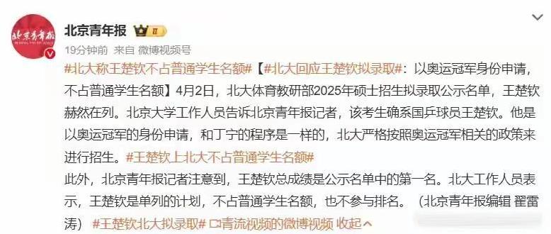 王楚钦晒北大入学照,没第二天就有一个女人打电话说王楚钦占用编制和全日制名额,第二天北大就回应其考研:以奥运冠军身份申请,不占普通学生名额打脸不,看着别人优秀自己眼红,