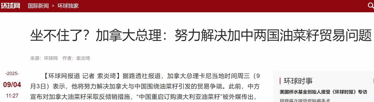 又一国听懂了中国声音愿意好好与华对话了 据加拿大媒体《环球邮报》9月5日消息,总理卡尼表示将于9月亲自来华讨论有关贸易产品出口问题。 中国是全球最大的油菜籽进口国,而加拿大是全球最大的油菜籽出口国。现在中国暂缓进口加拿大油菜籽了,只需坚持几十天加拿大农场主的损失就是数十亿美元。 没有阅兵前加拿大政府以为硬刚中国,会逼得中方屈服,现在直接不装了亲自来谈了,挺好!