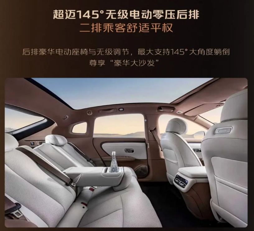 他和小鹏的设计差不多,也是冰箱+800V,而且也有大倾角,电动后排调节。