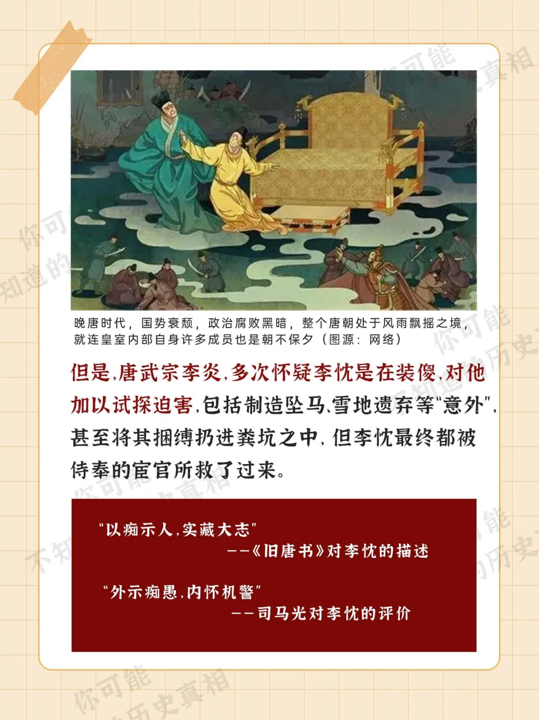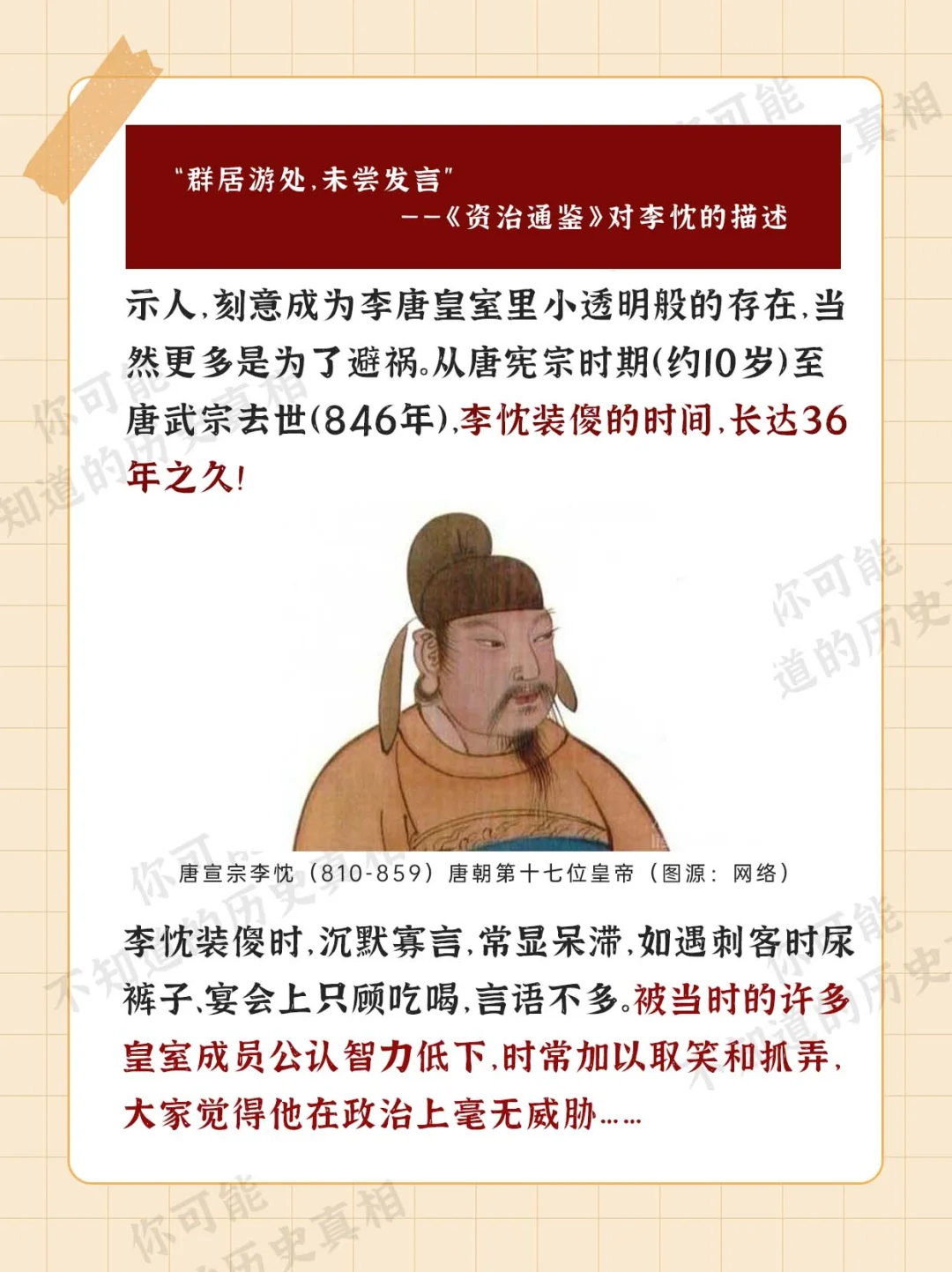 [微笑R][微笑R][微笑R]装傻 在东方社会中 可谓是一种生存智慧 然而[偷笑R][偷笑R][偷笑R] 短时间装傻不难 但装傻三十多年 就不是谁都能做得到 今天说的这位皇帝[萌萌哒R][萌萌哒R][萌萌哒R] 却成功装傻36年而不被察觉 而他[斜眼R][斜眼R][斜眼R][斜眼R][斜眼R]又是谁?? 人文历史趣发现 历史文化 唐朝 唐宣宗 傻子 历史 中国历史 晚唐 奇葩 趣事装傻装笨三十多年,容易吗? [PK]