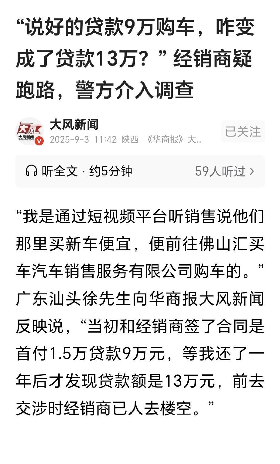 一当又一当,当当不一样!广东汕头,一男子花10.5万买了辆奇瑞艾瑞泽8,他签下合同: 首付1.5万,贷款9万,60期还完,第一年月供2886元,第二年起,每月还1355元,直至还完,谁知一年结束,月供没变,还是2886元,男子到放贷公司一查,9万贷款变成了13.5万,其中车辆贷款11.8万,附加品1.7万,男子找经销商理论,可对方早就关门跑路,男子拿出合同仔细一看,直接傻眼: 这合同有猫腻! 徐先生气的连连顿足,自己一时贪小便宜,被汽车经销商给骗了,他原本买车贷款9万,如今却变成了13.5万! 原来,徐先生在短视频平台上发现,有个销售说在他家买新车可享受大额优惠,徐先生十分高兴,兴冲冲赶到这家销售公司。 徐先生赶到之后,果然看到公司展厅摆了多辆汽车,他全部看完,选择了一辆奇瑞艾瑞泽8。 这辆车外形高档,看起来十分不错,徐先生一看价格,他能接受,官方指导价为12.98万。 可是,徐先生认为,既然你们说可以享受高额优惠,那么,就该再优惠些,也不枉我跑了这么远路,从外地特意到你们这购车。 销售一笑,态度特别热情,俩人经过一番讨论,最终按105000元的价格成交。 这个价格,是裸车价,价格太合适不过,徐先生高兴,立刻就和经销商签了合同。 这辆车首付1.5万,贷款90000元,分60期还完,第1年月供2886元,剩下的钱,四年还完,每月月供1355元。 徐先生一想,这样还钱,能够接受,生活不受影响,有了自己的车辆,生活还会更加方便。 办完手续,徐先生开车回家,一路高兴,回去继续上班挣钱。 时间很快就过去了一年,按照时间推算,从2025年8月起,月供就会降低,从2866元,降低到1355元。 可是,到了还款日,徐先生发现,扣划走的金额依旧是2866元。 徐先生以为搞错,立刻就和放贷公司联系,公司一听,查询了一下,发现徐先生贷款根本不是100000,而是135000元。 徐先生惊掉了下巴,怀疑自己被销售公司骗了,他立刻赶往放贷公司,发现自己的贷款竟然存在另一份合同。 合同上显示,徐先生一共贷款13.5万,其中包括,车辆贷款11.8万,附加品1.7万。 徐先生欲哭无泪,他压根没看到过这笔钱,他买车时,办理了购车抵押贷款,公司放贷款时,直接把钱打到了经销商手里。 徐先生傻眼了,他还了一年贷款,一直以为只贷了9万元,万万没有想到,自己实际贷款是13.5万。 徐先生拿出当初和经销商签署的贷款合同,他这才发现,合同上只有自己摁下的指纹,并没有经销商的印章。 在徐先生买车时,经销商还告诉他,如果放贷公司回访,要他如何如何的回答。 如今想起来,一切都是假的,是经销商怕放贷公司回访后,徐先生若如实回答,会导致露馅。 徐先生明白,自己确确实实是被骗了,他悔不当初,贪小便宜。 徐先生报警,这才发现,同样被骗还有十几个人,他们有同样的经历,都是发现被经销商骗了高额贷款,才来报警,他们这才明白,所谓的高额优惠,不过是一个骗人的幌子。 之后,徐先生还不死心,不能就这样白白被骗,他再次来到那家汽车销售公司,如今那里冷清,一个人影都看不见。 门店已经关门,当初那个热闹场景,现在想起,那就是个笑话。 徐先生购买车时,这里还停放着50辆新车,整整齐齐,一点也看不出来是个骗子公司。 天眼查上显示,2024年5月,该汽车销售公司成立,2025年3月,公司申请注销,4月3日公司注销完毕。 目前,警方已经立案调查。 那么,这件事在法律上是怎么认定的呢? 《民法典》第148条规定: 一方以欺诈手段使对方违背真实意思实施的民事法律行为,受欺诈方有权请求法院或仲裁机构予以撤销。 经销商与徐先生签下合同,首付1.5万贷款9万,但实际签订的贷款合同是13.5万元,包括未告知的1.7万元附加品,属于典型的欺诈行为。 徐先生可主张撤销购车合同,要求返还已支付款项并赔偿损失。 但因经销商已注销,需要通过刑事追赃程序实现权利。 《民法典》第490条规定: 若合同未采用书面形式但一方已履行主要义务且对方接受的,合同成立。 徐先生持有的合同仅有其本人指印而无经销商盖章,形式上存在重大瑕疵,经销商可能会以未盖章主张合同未成立。 但是,徐先生已支付首付款、接收车辆并偿还贷款一年,符合实际履行要件,因此,应该认定合同成立。 经销商的行为构成三重违法: 1、隐瞒关键信息:未告知"附加品1.7万元"的具体项目及用途。 2、虚假宣传:经销商在短视频平台发布大额优惠广告,引导消费者签约购车。 3、欺诈性销售:经销商教唆徐先生,伪造贷款回访应答话术。 但是,因为经销商已将公司注销,徐先生等多位受骗者需要通过警方追查资金流向,后续如何,拭目以待。 对此,你怎么看? 关注@王哥说法 #头号创作者激励计划#