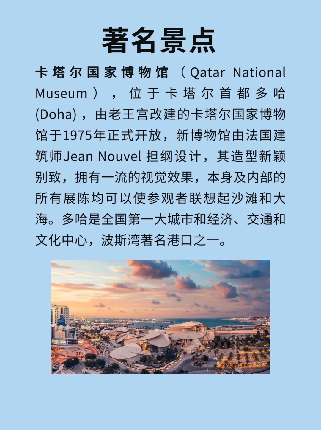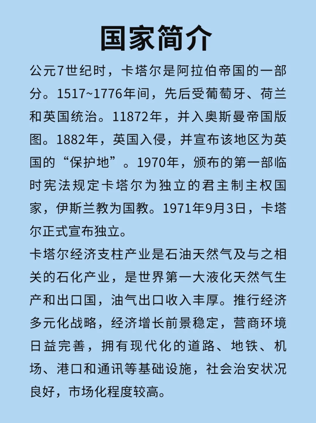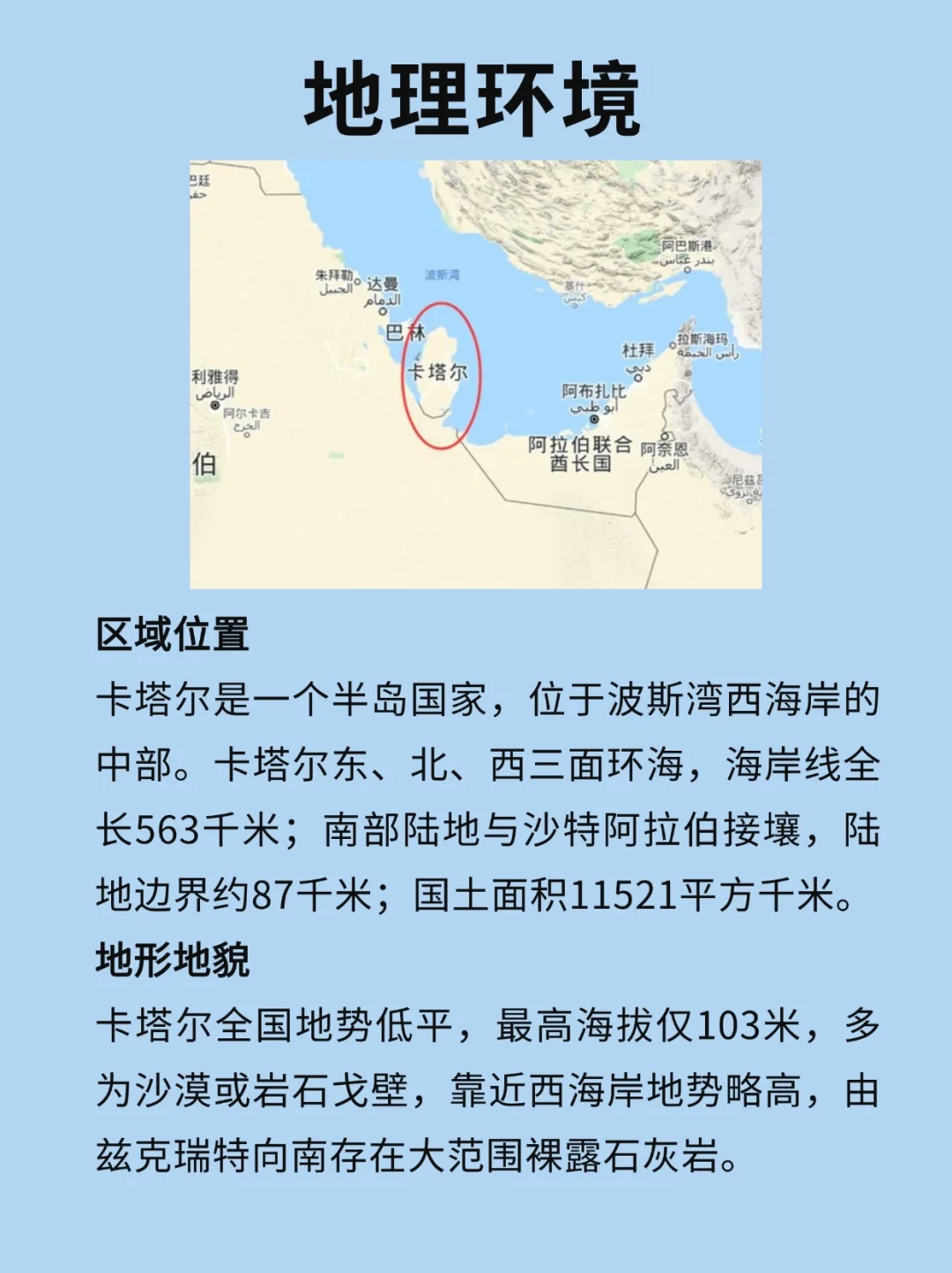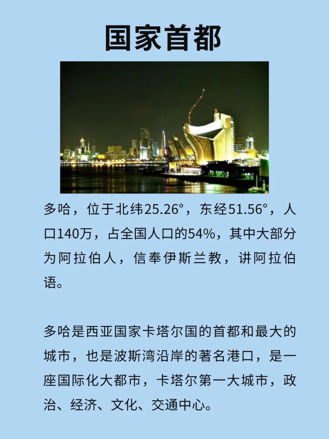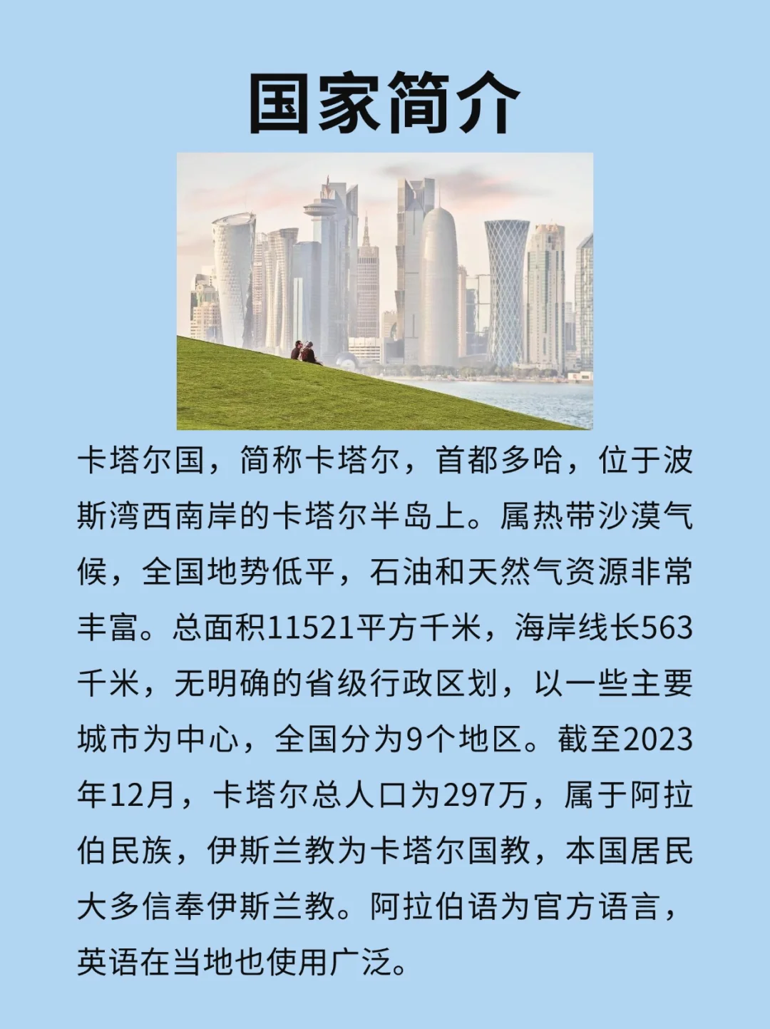 [打卡R]卡塔尔国(阿拉伯语:دولة قطر,英语:The State of Qatar),简称卡塔尔,首都多哈,位于波斯湾西南岸的卡塔尔半岛上。属热带沙漠气候,全国地势低平,石油和天然气资源非常丰富。 [彩虹R]总面积11521平方千米,海岸线长563千米,无明确的省级行政区划,以一些主要城市为中心,全国分为9个地区。 [种草R]截至2023年12月,卡塔尔总人口为297万,属于阿拉伯民族,伊斯兰教为卡塔尔国教,本国居民大多信奉伊斯兰教。阿拉伯语为官方语言,英语在当地也使用广泛。