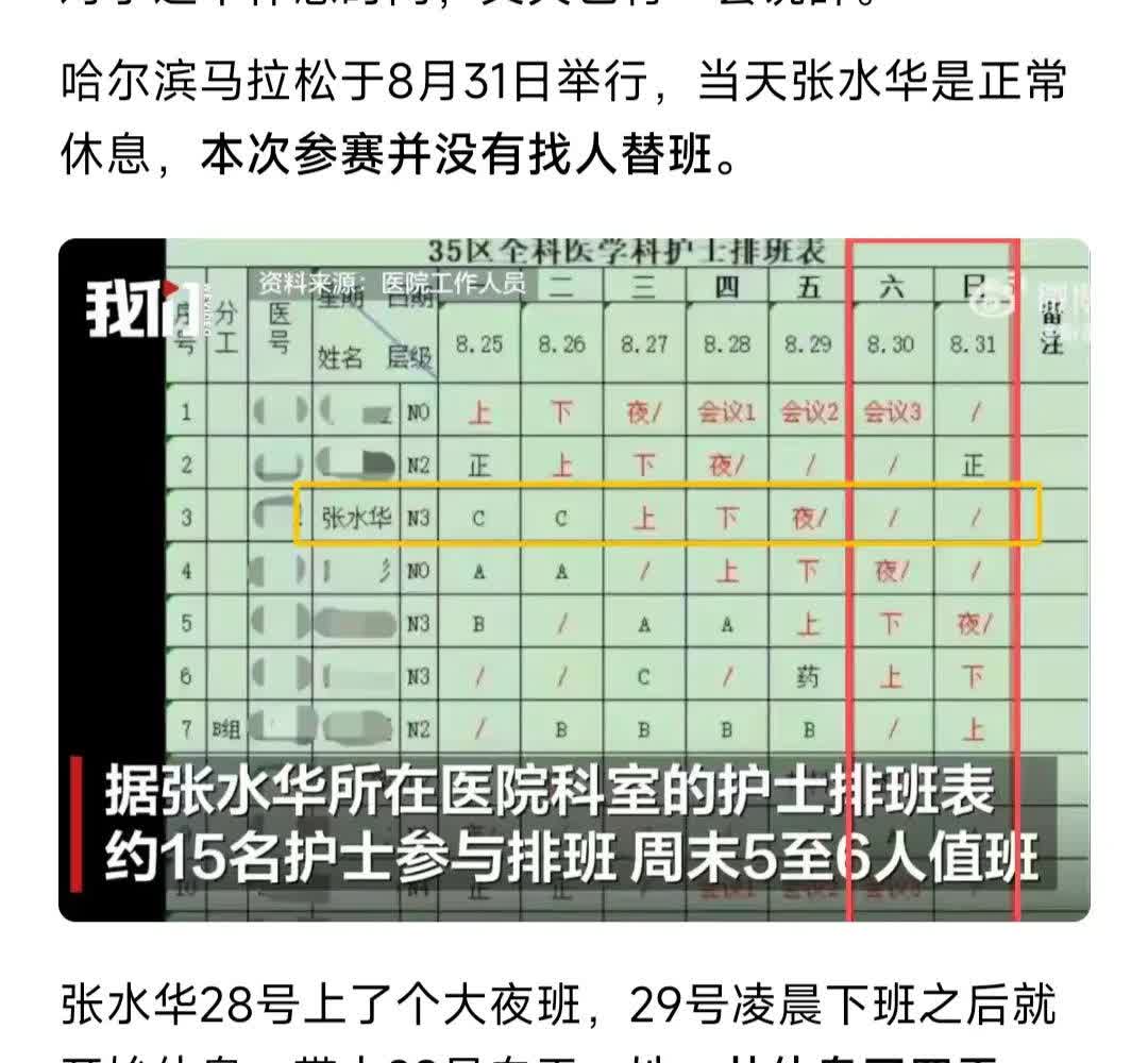 看最快女护士丈夫接受采访发出的排班表, 这个医院的护士待遇挺好的, 参加哈尔滨马拉松用了4天休, 基本不影响出去参加马拉松! 医院领导同事挺支持的! 可能问题出在一年20场比赛上, 会有和休息撞车的时候!