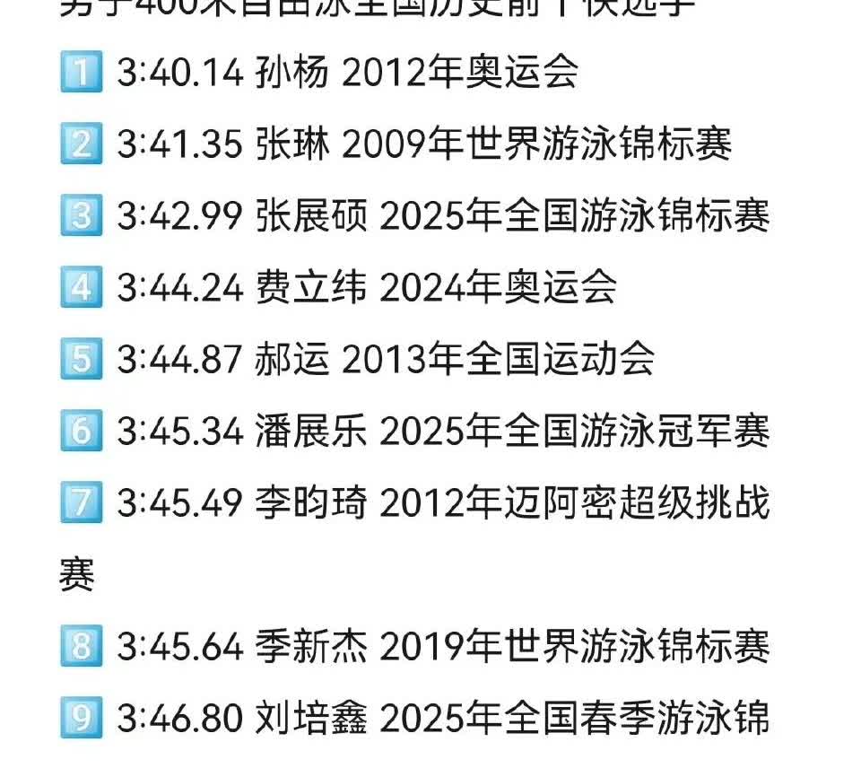 不到两个月,18岁张展硕再现爆炸性发挥,400米自由泳成绩直逼孙杨! 18岁张展硕游出了3分42秒99,比40多天前在新加坡世锦赛游出的3分44秒82快了几乎2秒!而18岁的孙杨3分42秒47,也就是0.52秒的差距!距离孙杨职业生涯最好成绩差了2秒。 这个成绩还超越了奥运冠军潘展乐5月在全国游泳冠军赛的3分45秒34,自由泳已经形成了争先恐后、你追我赶的局面。 本次400米自由泳冠军张展硕只有18岁,加上银牌得主刘培鑫19岁,铜牌得主李诚宇更只有16岁!再加上潘展乐21岁,中国游泳人才辈出不再是句空话,不出意外,肯定能在洛杉矶奥运会大放异彩。