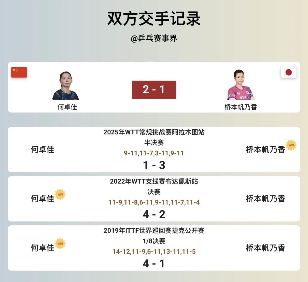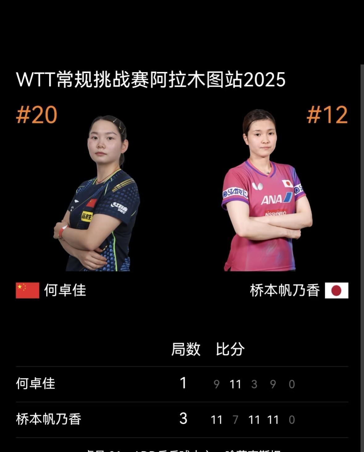 没等到国乒选手复仇桥本帆乃香,削球女王桥本帆乃香反而在常规挑战赛阿拉木图站,成功复仇了何卓佳。 何卓佳是少数赢过桥本帆乃香的国乒选手,而且此前是保持了全胜战绩,这是非常惊艳的成果。 因为除了孙颖莎,王曼昱之外,包括但不限于王艺迪、陈幸同、蒯曼等所有国乒选手,对桥本帆乃香的历史战绩是,加起来赢过零次。 然而,在今晚,何卓佳没有抵挡住桥本帆乃香的进攻,桥本女王成功完成了自己的复仇,闯出半区。 现在除了孙颖莎、王曼昱两大主力外,没有人能够拿头对头数据,来刻舟求剑现在的桥本帆乃香了。 桥本帆乃香的确很难打何卓佳,削球手都被逼急了,桥本连续进攻失误,5:1的领先局面,被何卓佳直通6:9。 不过,桥本帆乃香不是普通削球手的原因,就是她超敢进攻。 桥本进攻连丢6分,居然还敢弹,无论失误成什么样,还敢继续进攻,失败的进攻,就要用成功的进攻弥补回来。 桥本帆乃香连得5分,直接锁定胜局,以3:1的大比分,挺进决赛。 好了,女单决赛是覃予萱对阵桥本帆乃香。 看得出来,国乒对桥本帆乃香做了充足的准备,纵歌曼这次也打得很有章法,有备而来。 很多人都能和桥本打得胶着。 但是最后的胜者还是桥本帆乃香。 现在看“小蘑菇”覃予萱吧,上次见面,覃予萱不仅被零封,三局一共就拿了13分。