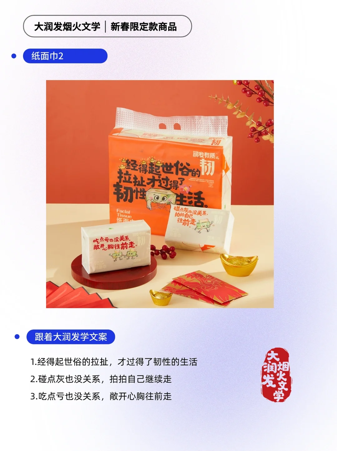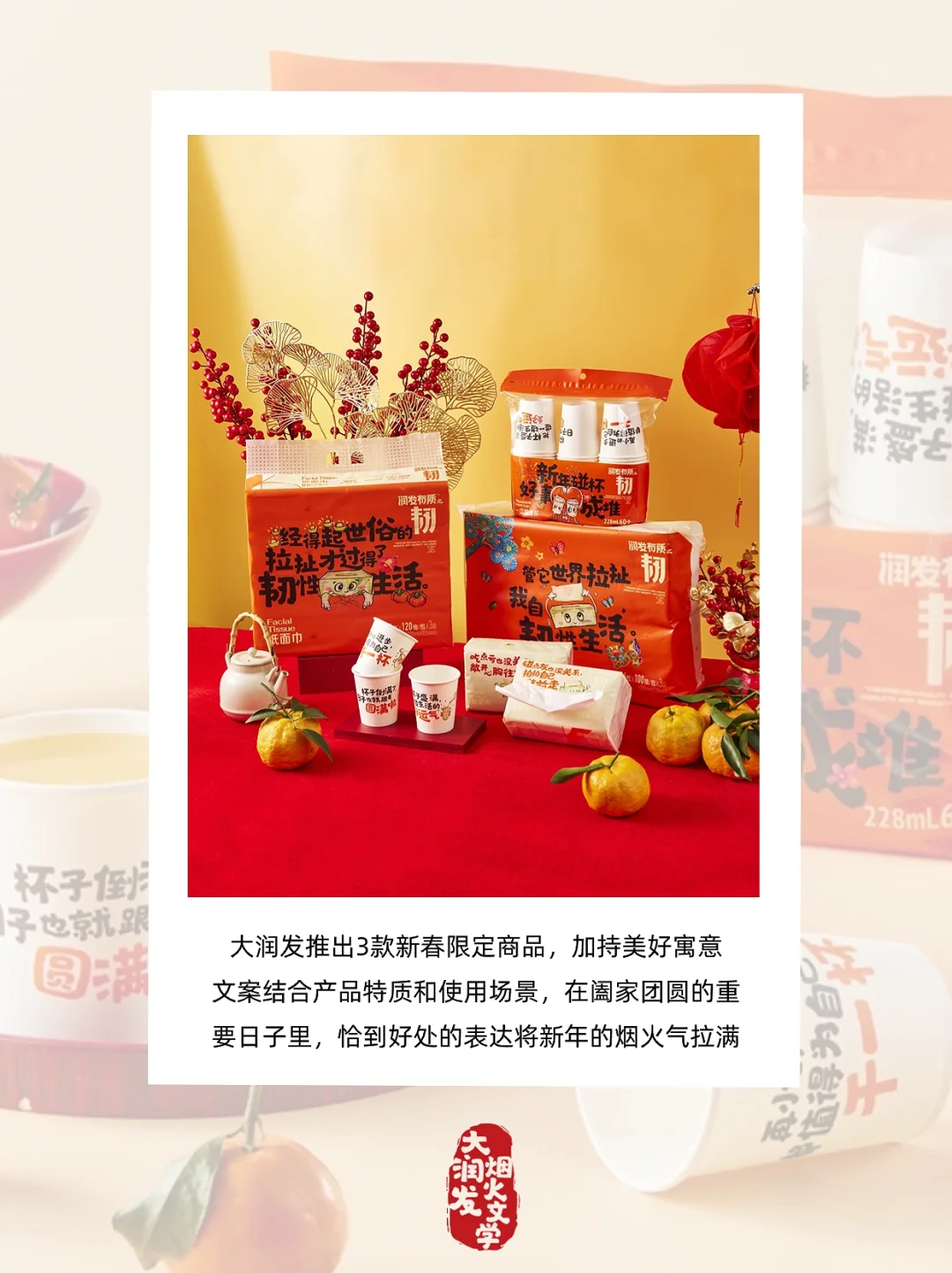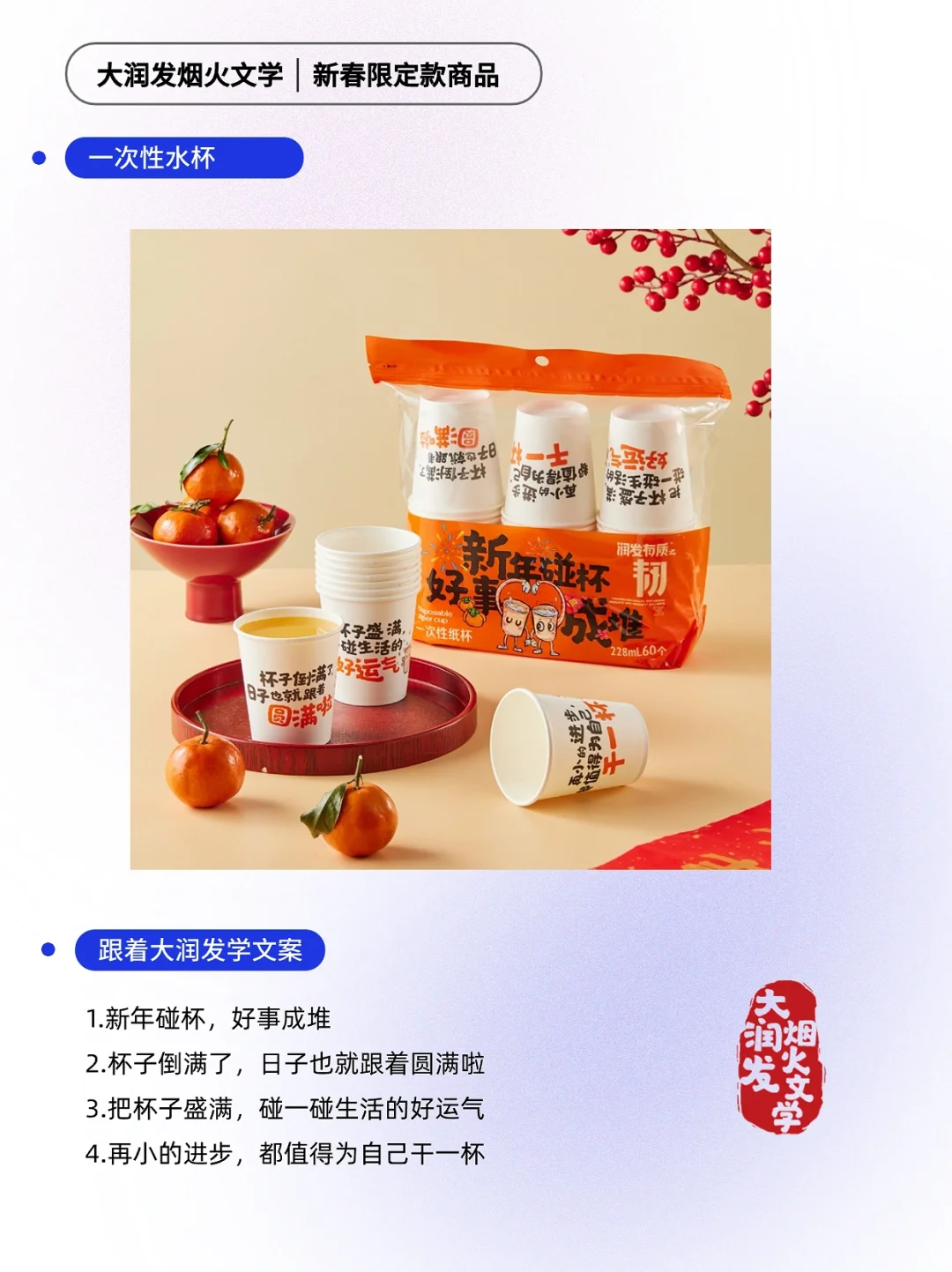 自从「冷宫蔬菜」爆火出圈以来,大润发烟火文学系列至今更新了10期+,围绕超市蔬菜、生鲜、快消等商品金句频出,以幽默化的表达给商品赋予了人格,或玩梗或调侃,令人上头,堪称年轻人的“互联网嘴替”,引发一众用户强烈共鸣🫡 在新年即将到来之际,大润发又开始发挥它的实力了[doge] 这一次,大润发自有品牌「润发有质」商品研发团队,联合「烟火文学」内容团队,共创推出[三R]款新春限定商品,结合产品特质和新年场景,将烟火文学玩转到了过年必备的纸巾和一次性水杯上[烟花R] 包装上的文案是点睛之笔,新年有新意,文案背后代表着人们对新一年的期盼与祝福,“新年碰杯,好事成堆”,“再小的进步,都值得为自己干一杯”,配合文案举杯的那一刻,可以说情绪价值拉满了,为新春增添不一样的烟火味道[福R] 🔵文案分享如下: 1. 新年碰杯 好事成堆 2. 杯子倒满了 日子也就跟着圆满啦 3. 把杯子盛满 碰一碰生活的好运气 4. 再小的进步 都值得为自己干一杯 5. 管它世界拉扯 我自韧性生活 6. 踩点坑也没关系 放平心态往前走 7. 淋点雨也没关系 擦擦坏情绪往前走 8. 经得起世俗的拉扯 才过得了韧性的生活 9. 碰点灰也没关系 拍拍自己继续走 10. 吃点亏也没关系 敞开心胸往前走