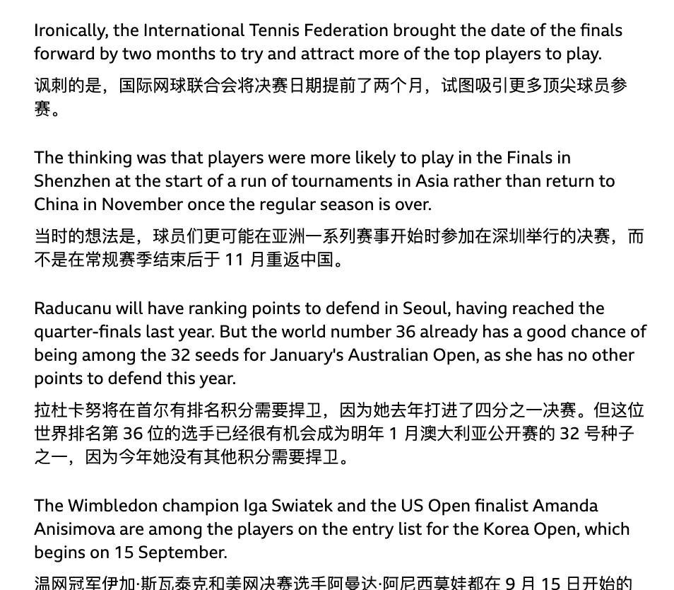 拉杜卡努的最新消息来了! 她已经退出深圳“比利简金杯”总决赛,将持外卡参加同期的