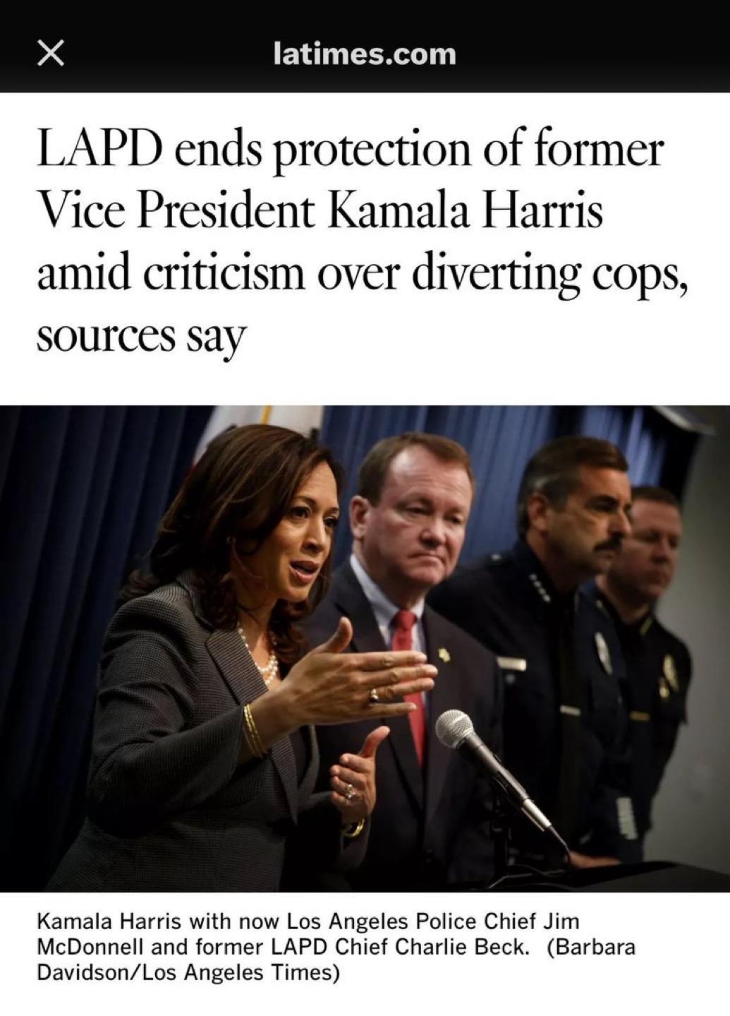 周六,在特朗普停止特勤局对卡玛拉·哈里斯的保护几天后,洛杉矶警察局也停止了对她的