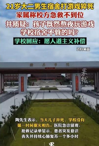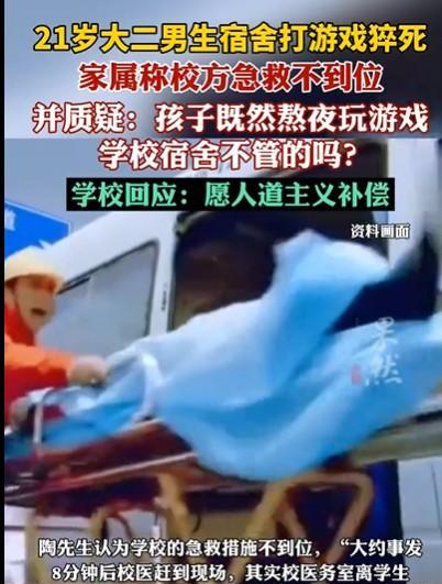 江西抚州,大二男生一下课,就奔回宿舍玩游戏,玩着玩着却猝死了,学校联系家长,家长却说学校急救不到位,3分多钟的时间,校医8分钟才赶到,家长还说,学校是教书育人的地方,孩子熬夜玩游戏,学校为何不管? 据大风新闻,9月6日报道,6月11日,陶先生接到学校打来的电话,学校跟他说,他的孩子晕倒了,让他赶紧来学校,他不知道孩子到底发生了什么,他很紧张,就跟学校说,让学校把孩子送到最好的医院,他不在乎钱。 他以为孩子只是突发疾病了,他们不在孩子身边,孩子出事了,他们自然紧张,可他不知道的是,孩子其实已经离世了,而孩子到底发生了什么,他一概不知。 他当时只是知道孩子出事了,他和妻子惊慌失措,不知如何是好,他们只想着赶紧来到孩子身边,照顾孩子。 他们一路赶时间,可是还没来到高铁站,他们又接到了医生打来的电话,医生告诉他们不要来医院,去殡仪馆。 那一刻,陶先生的手机差点摔落在地,妻子问他怎么了,陶先生哽咽地说,孩子没了。 话说完,陶先生脑子一片空白,耳边只听到妻子在嚎啕大哭。 不管孩子发生了什么,当陶先生和妻子知道孩子已经离世的那一刻,他们心碎了。 他们踉踉跄跄来到殡仪馆,看到他们孩子已经永远地闭上了眼睛,似乎只是睡着了而已,身上没有任何受伤的地方。 孩子应该不是意外离世的,那到底是发生了什么,他们赶紧问学校,这时学校才说,孩子玩游戏晕倒,然后就猝死了。 事情怎么可能这么简单,他的孩子身体那么好,怎么可能会猝死,陶先生不相信。 他便追究下去,问了孩子的室友,又看了相关的监控,这才知道,孩子晕倒的时候,有室友去找校医,但校医需要8分钟时间才来到。 陶先生特意看了看医务室和孩子宿舍的距离,正常走路时间,三分多钟就可以到达,于是陶先生觉得学校急救措施做得不到位,如果校医能够早一点来到,争取黄金抢救的那几分钟,孩子可能就活过来了。 而且学校也承认,他们是有除颤仪的,但是没有用,当时陶先生还特意将学校说的这个话录了下来,所以陶先生更加认为他的孩子发生意外,与学校有很大的关系。 要不然为什么学校在通知的时候,没有第一时间告诉实情,孩子明明已经离世了,却是通知晕倒。 他们深爱的孩子就这样没了,他自然要学校给个说法,学校却跟他说孩子是玩游戏猝死的,跟学校没有关系。 听到这个说法,陶先生更是痛苦了,孩子是在学校出事的,学校却不想承担责任,他据理力争和学校理论。 陶先生表示,既然孩子是熬夜玩游戏猝死的,那为什么学校不管,明知道学生会熬夜玩游戏,就应该禁止学生熬夜玩游戏。 他说,学校是教书育人的地方,他把孩子放到学校,学校就应该管,孩子熬夜玩游戏和学校就有关系。 但是学校态度强硬,只表示会尽人道主义赔偿。 如今,发生这件事已经过去了几个月,陶先生说到现在校方也没有给出一个明确的处理说法。 对此校方表示,学校是很重视的,但是还在商讨中,需要一点时间。 那么发生这样的事情,应该从几个方面来分析呢? 1、 从学生本身来说,学生已经读大二了,是完全民事行为能力,应当有一定的自控力,他熬夜玩游戏本身有过错。 《民法典》第1165条规定:行为人因过错侵害他人民事权益造成损害的,应当承担侵权责任。 如果他能控制自己的行为,在学校制定的作息时间休息,事情就不会发生。 2、 从家庭教育来说,家长可能以为孩子已经长大,没有尽到该尽的家庭教育,家长也有责任,家长应当注重家风建设。 《民法典》第1043条规定:家庭应当树立优良家风,弘扬家庭美德,重视家庭文明建设。 如果家长注重家风建设,时时刻刻关心孩子的情况,关注孩子的身心健康,给予适当的建议,孩子也不会熬夜玩游戏。 3、 从学校的角度出发,学校需要履行安全保障义务,对学生进行教育,控制学生玩游戏的时间。 《民法典》第1198条规定:宾馆、商场、银行、车站、机场、体育场馆、娱乐场所等经营场所、公共场所的经营者、管理者或者群众性活动的组织者,未尽到安全保障义务,造成他人损害的,应当承担侵权责任。 不过学校是很难禁止学生玩游戏的,大学生不像小学,初中,高中生,学校可以禁止拿电子产品,大学生靠的是自觉。 那么你觉得发生这样的事情,应该怪谁呢?来源:大风新闻 9月6日