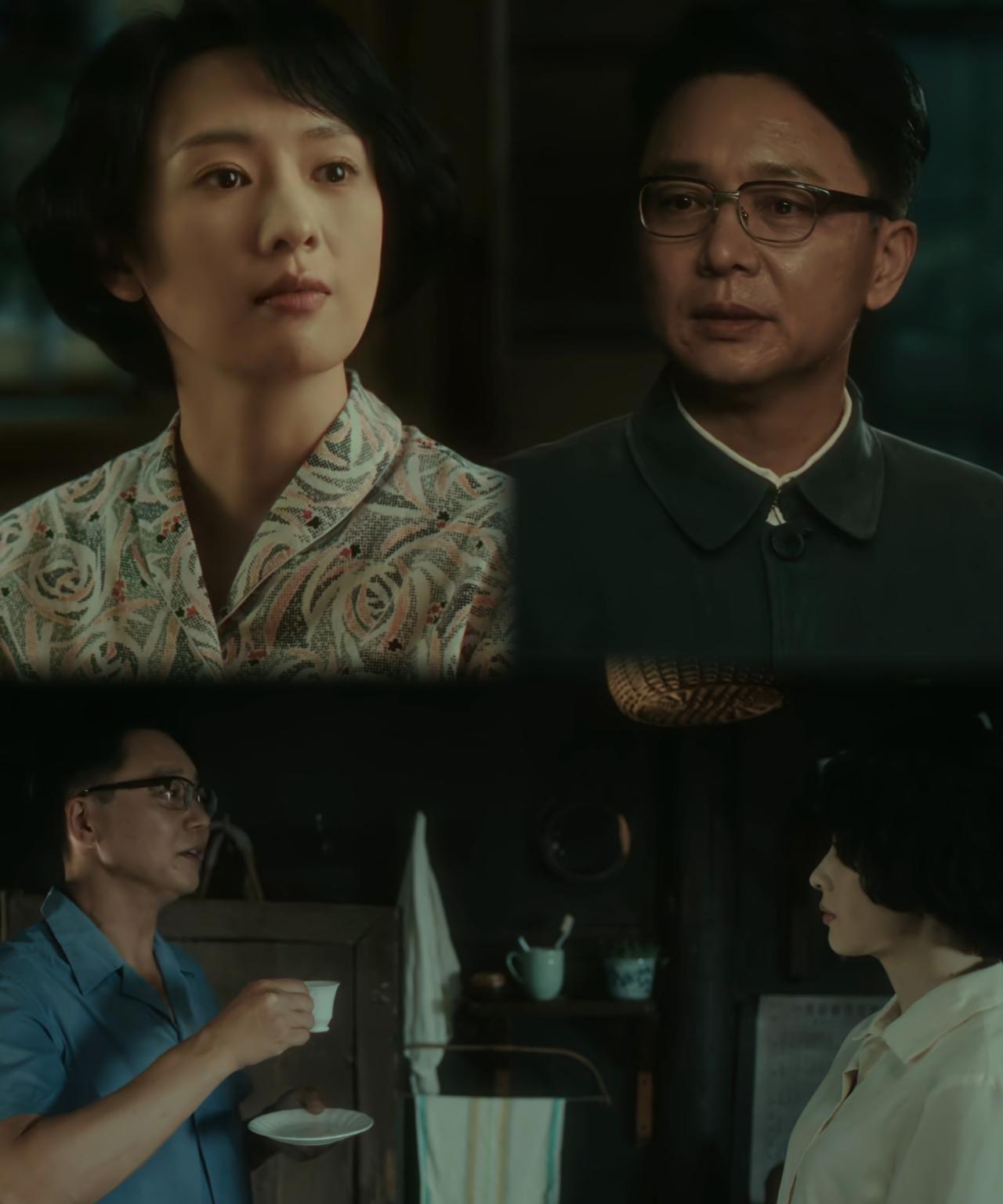 来看看电视剧《足迹》里童瑶的老年妆。虽然没有《生万物》里杨幂的妆容那么细腻入微,但也用心了。脸部下垂的褶皱很逼真。 话说《足迹》三十年代篇章已圆满收官。程敖和林斯允活了下来,抗战胜利后出国经商。曾大伦、沈奕群、林经涵三个“渣男”都命丧黄泉。(图3) 应了那句,善有善报,恶有恶报。 跟随晚年易弋的回忆,时间来到新中国成立后的五十年代,童瑶和刘奕君登场。(图4) 易弋和文朴相识,二人的感情悄然发芽,期待后面的故事!