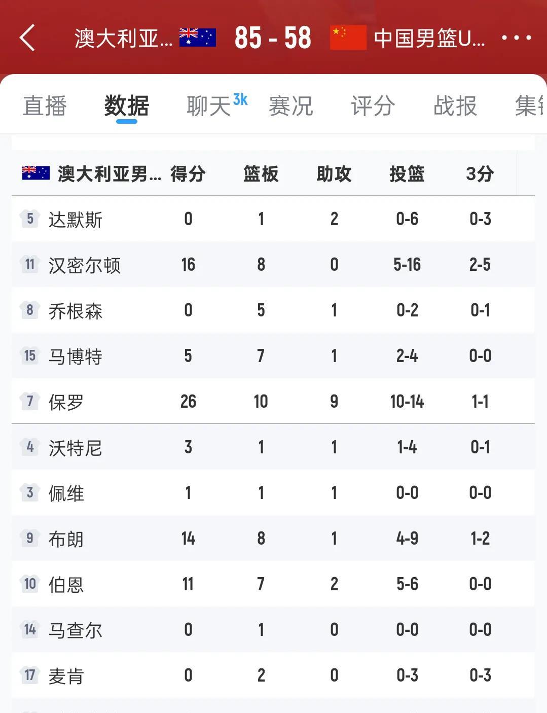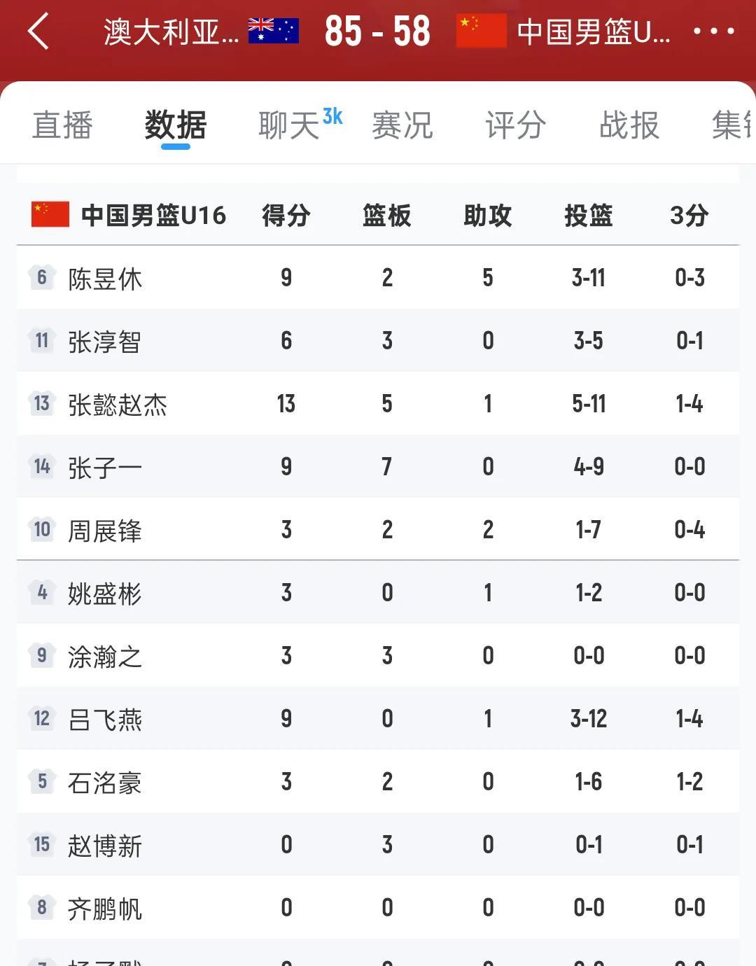 亚军,又是一个亚军,中国男篮U16亚洲杯决赛输给澳大利亚获得亚军 这是今年中国篮球国际比赛继成年组获得亚军后的又一个亚军,对手都是澳大利亚 8年前2017年的U16亚洲杯决赛中国队67:91惨败澳大利亚 2017年U16男篮亚洲杯决赛中国队阵容包括杨阿力、赵仕浩、焦泊乔、张明敏、西尔扎提、艾孜麦提、卢鹏羽、曲虹霖、孙浩钦、陈彭宇迪、佟鑫、闫实 这个阵容名单没有国家队球员,估计也不会有人进入了 今年的决赛中国队澳大利亚 分差依然很大,58:85输球又是惨败,中国队只顶住半场,下半场崩盘 ,他们缺少的是郭士强指导的训练,比赛原则,所以没能坚持到最后 2025年U16男篮亚洲杯决赛中国队阵容 姚盛彬,石洺豪,陈昱休,杨子默,齐鹏帆,涂瀚之,周展锋,张淳智,吕飞燕,张懿赵杰,张子一 ,赵博新 按照这个逻辑,和实际比赛情况,有几个人能成才,能进入国家队 决赛是因为澳大利亚命中率太低,否则中国队输得更多 第一节双方投篮命中率都不高,也许是半决赛澳大利亚的过于输出,把子弹打光了 第一节比赛 中国队比分16:17落后一分 第二节比赛 中国队比分17:17双方打平 第三节比赛 中国队比分10:21落后11分 第四节比赛 中国队比分15:30落后15分 最终比赛结果58:85输了27分 总体数据完全落后,需要总结提高的地方一目了然,但是决赛是澳大利亚命中率低,不是我们有多强大,下半场体能下降,进攻手段单一,篮板球保护差,罚篮差,能达到这个分差不错了,看看日本输给澳大利亚多少分吧,小伙子们好好努力吧
