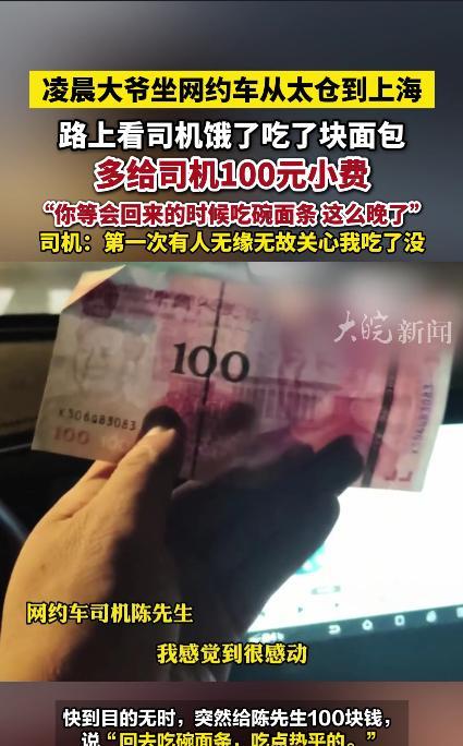 “泪目了!”9月6日,江苏苏州,一网约车司机凌晨载一位大爷去上海,利用等红绿灯的间隙,他狼吞虎咽的吃起了面包,大爷看到后心疼不已,快下车时突然塞给男子100块钱,让他回去时吃碗面条,吃点热乎的。网友:或许大爷想起了在外奋斗的孩子! 如今网约车已经很普及了,方便了人们的出行,而在和网约车司机的聊天过程中,很多人都只关乎他们每天能赚多少钱,却很少有人在乎他们到底累不累。 这天凌晨1点多,陈先生接到了一笔新的订单,要载乘客去上海,这可是笔大单子,一百多块钱呢,陈先生立即前往上车地点接上了老人。 一路上,二人没有过多的交流,只有陈先生在等红绿灯啃面包的时候,老人说了句“太辛苦了!” 经过一个多小时的奔波,很快就要抵达目的地,就在这时,老人突然掏出100元现金塞给陈先生,让他回去的时候吃点热乎的。 陈先生表示,开了10年的网约车,虽然也收到过很多次小费,但基本上都是帮乘客赶时间人家打赏的,这还是第一次被人关心而收到的小费,这令他非常感动。 陈先生表示,以后会将这份善意传递下去,面对那些需要帮助的人,自己也会主动伸出援手! 网友看后表示,有时候陌生人的突然关心,才是最令人破防的瞬间,希望大家都能够被生活温容以待。 信息来源:《大爷凌晨搭网约车,心疼司机吃面包打赏100元,司机:非常感动》焦点24小时