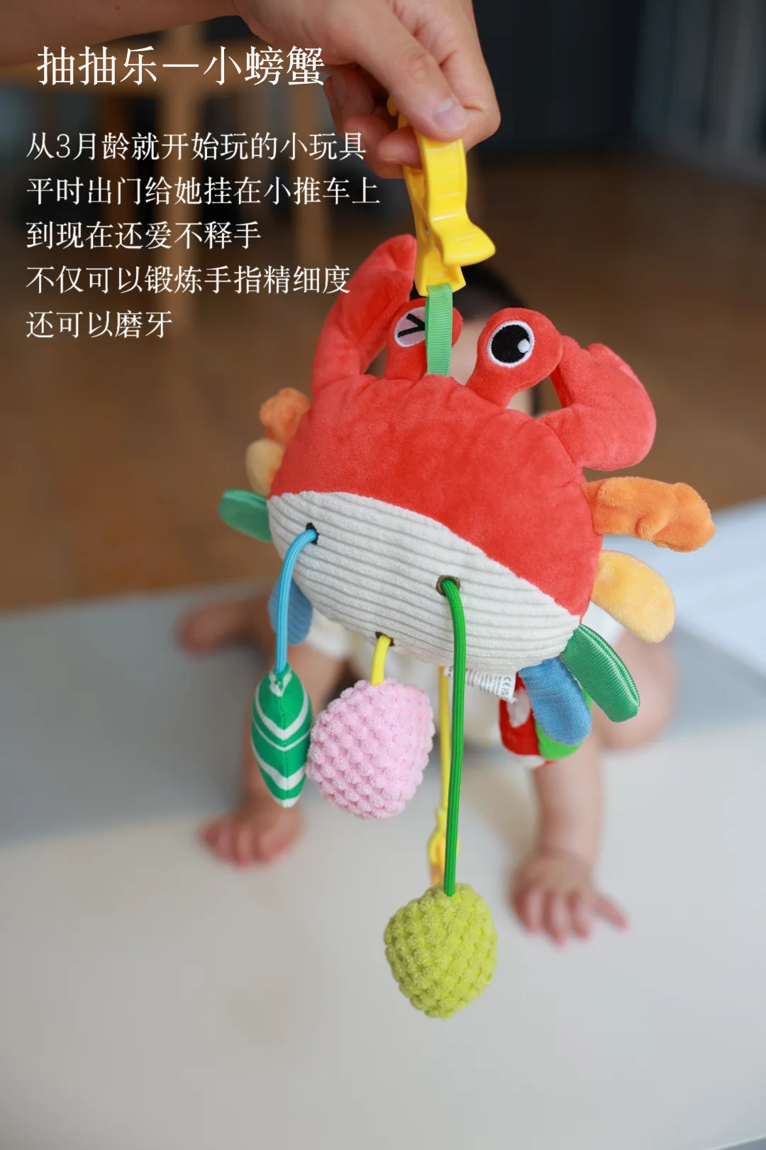 🦀小螃蟹抽抽乐 抽拉绳子会有声音,吸引宝宝主动伸手拉 宝宝被逗得哈哈笑 锻炼因果关联认知和追视,偶尔还可以磨牙