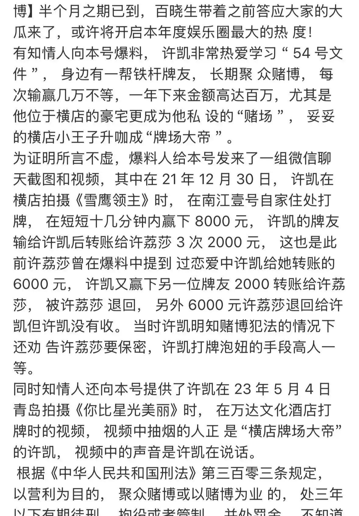 顶流许凯塌成废墟, 主要惹了3个不该惹的人。 第一:前女友 若许凯在感情里坦荡一点,或者说能和许荔莎好聚好散,就不会有这些因爱生恨的故事情节了。 奈何他相当自信,长得帅又是顶流,所以免不了要沾花惹草,这就给自己惹下了大麻烦。 女人极致的爱和恨都是很可怕的,许凯不懂这一点,栽了。 第二:于正 于正作为许凯的顶头上司,肯定是想力保他的。 毕竟,许凯是欢娱公司的顶流,决定了公司的收成。 奈何,这个许凯真是个大嘴巴,啥事都往外说,不仅给女友八卦老板的白月光,还把自己见不得光的事都说了,还留下了铁证“聊天记录”。 这智商不够用的种种行为,实在不值得于正为此劳心劳力。 第三:站姐 许凯出了这档子事,站姐是最忙的。 其实,半个月前,前女友就放下狠话了,站姐忙前忙后的搜集挽尊的证据控制评论,奈何许凯没当回事。 现在事情曝光了,站姐肯定也气坏了,气许凯不争气啊。 从站姐的角度看,自己忙前忙后的为艺人做数据挽口碑争人气,结果到头来,艺人背着自己私下里偷摸搞事,还让人切切实实的抓到了这么多把柄,这搁谁能不气啊。 只能说,许凯这次,怕是无力回天了。 前女友显然是有备而来,还专门联合知名媒体曝料,就说明她决心要搞臭许凯,让他在娱乐圈混不下去。 许凯也真是的,前面有那么多艺人塌房的例子,他怎么就没汲取点教训呢?好不容易凭借自己的努力成为了顶流,结果一夜之间全没了。 只能说,艺人,真是知人知面不知心啊,不守规矩没有准则的,注定要被淘汰啊。