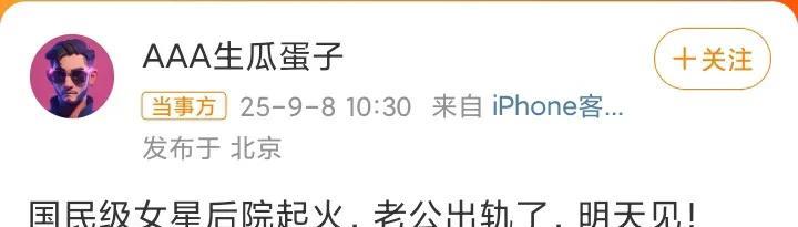 今天最意外的瓜,是某国民级女星的老公出轨! 9月8日,有娱记在网上爆料,某国民级