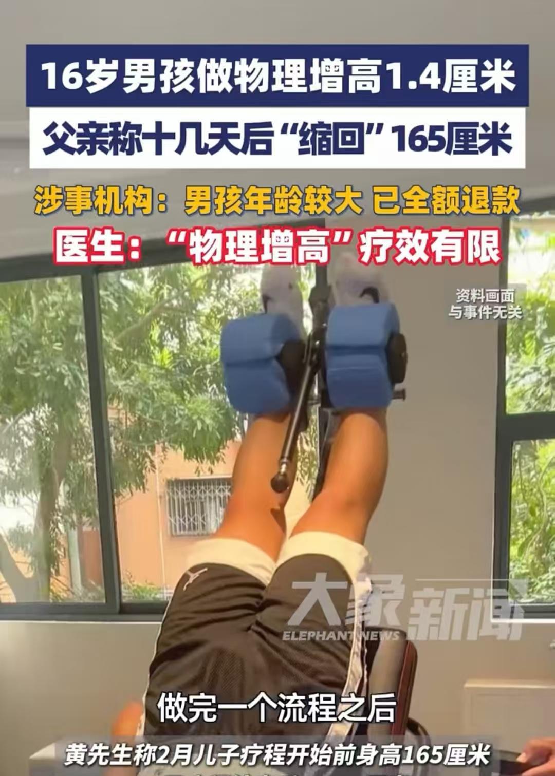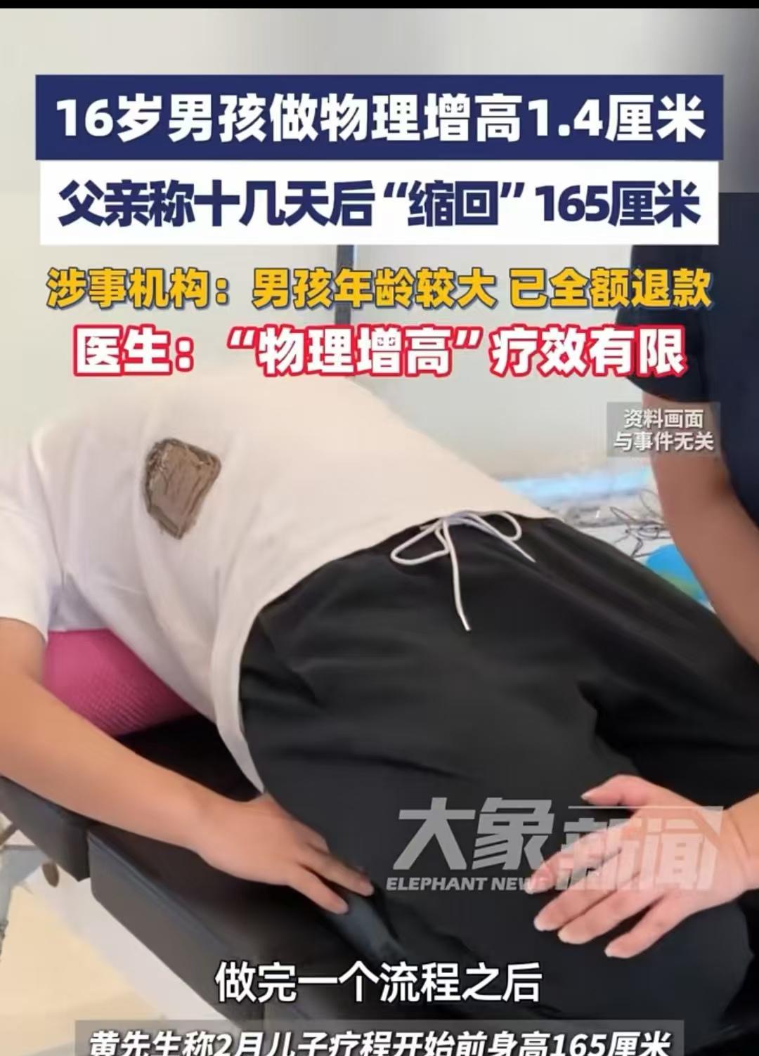 厦门,一名16岁的男孩,看到身边的同学都比自己高,就想去物理增高。父亲为他交了半年费用,经过训练,男孩从165厘米长到166.4厘米,一家人都特别高兴。可是过了十几天,身高却莫名回到之前的高度,这让父子俩既难过又失落。最后他们想找机构看看有没有其他解决办法,负责人却说,你儿子年龄偏大,效果不佳,还是不要再来了,我把钱退给你们。 黄先生的儿子已经16岁,身高却不尽如人意,只有1.65米。黄先生有些着急,照这样的生长趋势,儿子身高最多只能长到1米7多一点,他担心这会让儿子今后的人生大打折扣。 要知道,人的外表还是很重要的,尤其是身高,结合现在的综合情况来看,男孩子还是要长到1米8左右才好,这几乎是最基本的条件。 儿子也觉得自己太矮了,每次站队都在前面,倒不是因为成绩好,而是因为身高太矮,这让他心里有些自卑,总想着要是自己能再高一点就好了。 班上的女同学总是会关注那些高高帅帅的男同学,像他这样的矮冬瓜,基本不招女孩子喜欢,在班里就是小透明。 所以,只要一谈到身高,一家人就都非常焦虑。为了让孩子长高,他们每天都会用大骨头给孩子炖一锅汤,让孩子多喝,盼着能有点效果;平时补钙的产品也陆陆续续给孩子安排上,就希望通过这些方法能让孩子多长高一些。 可在黄先生的观察里,做了这些努力后,孩子的身高好像没什么变化,生长速度相当慢。 后来,他无意间看到家附近有一家物理增高机构,瞬间像抓住了救命稻草,当即就想带儿子去试试。 其实儿子之前也一直在关注增高的信息,但在他的认知里,只有通过手术才能增高,可他又怕手术风险太大,一直没敢跟父亲提这件事,生怕术后留下后遗症,那样就得不偿失了。 而黄先生提到的物理增高,不会对身体造成任何损伤,只是通过锻炼、拉伸,再配合一些特殊的训练手法,让孩子在没有任何痛苦的情况下,安安全全地增高。 儿子很认同这种增高方式,于是在黄先生的陪同下,一起去了那家机构。机构工作人员介绍,一个疗程是半年,需要他们抽时间过来上课,还强调只有能坚持下来,他们才收钱;要是坚持不下来,还是别来了。 黄先生和儿子当时都很激动,连忙表示钱不是问题,时间也不是问题,最关键的是疗效到底怎么样。 负责人拿出了很多成功案例,又打量了一眼黄先生的儿子,说你家孩子年纪偏大,疗效可能没其他人好,但肯定会有效果,这一点可以放心。 黄先生和儿子就想听这句话,肯定会有效果,这让他们喜出望外,当即交了钱,开始了增高训练。 训练的过程其实很煎熬,孩子本来学业就紧张,还要抽时间去机构;而且训练也不是让人躺着享受,而是要借助一些辅助器具进行拉伸,这个过程并不好受。 但一想到能增高,黄先生和儿子就互相打气、给对方加油,坚信这次增高行动一定会有效果。 就这样,黄先生每天下班后,都会抽时间带儿子去机构锻炼;儿子放学后,也会马上给父亲打电话,说自己有空了,让爸爸赶紧来接自己去机构训练。 从2月到8月,父子俩一直没间断,期间看到身高有变化,更是坚定了他们的信心。 直到半年疗程结束,黄先生儿子的身高足足长了1.4厘米。虽然增高幅度不算大,但至少看到了效果,也让他们看到了希望,当时还想着要接着报下一个疗程,让孩子再多长一点。 可没想到,十几天后,儿子无意间量身高时,发现身高竟然又回到了之前的水平——半年前刚去机构时是165厘米,疗程结束时是166.4厘米,现在又变回了165厘米。 这让父子俩既纳闷又失落,花了这么多时间和精力,怎么身高还会反弹呢?黄先生想再坚持一下,继续报下一个疗程试试看,但儿子觉得不妥,自己这半年好不容易长高了,又反弹回去,说明物理疗法根本不可靠,还是别浪费时间了。 最后,黄先生找到机构负责人,把情况如实说了,还问对方这种情况该怎么办。 负责人也一脸无奈,说你家孩子年龄确实偏大,效果实在不好。这样吧,我把钱退给你们,你们也别折腾了,先把心思放在学习上。他这个年纪还能长高,平时尽量把营养跟上就行。 这件事不仅是黄先生一家的困扰,也折射出不少家庭的身高焦虑。 那么,黄先生的儿子花了半年时间进行物理增高,结果身高一点都没变,虽然机构退了钱,但这期间耗费的时间和精力,能要求对方赔偿吗? 根据《民法典》第五百七十七条规定,当事人一方不履行合同义务或者履行合同义务不符合约定的,应当承担继续履行、采取补救措施或者赔偿损失等违约责任。 本事件中,若合同明确约定增高效果而机构未达成,机构构成违约,黄先生可主张时间、精力相关的合理赔偿;若合同未明确约定效果,仅泛泛提供服务,主张时间精力赔偿难度较大。 对于这件事,大家又是如何看待的呢?文中人物均为化名,素材来源于大象新闻9月6日报道。