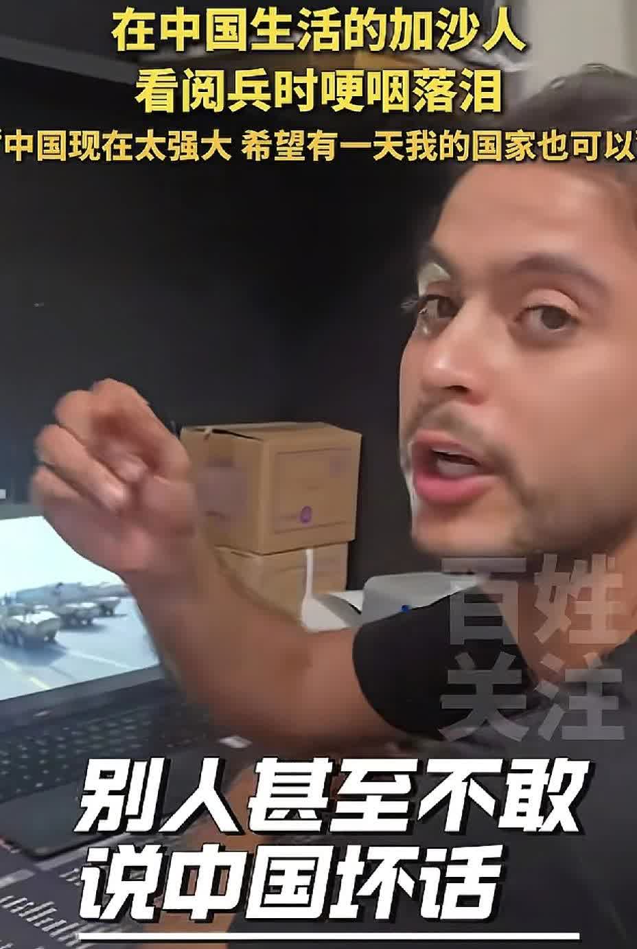 当时看完阅兵,哭的不止是伊拉克的方浩明,还有这位生活在中国的加沙人。他说巴勒斯坦什么都没有,如果你强大,别人都会怕你,所有国家都会尊重你,因为中国太强大了,所以别人甚至不敢说中国的坏话。他希望巴勒斯坦也有这么一天,他知道这不可能,但哪怕能学到一点就很好了。 其实中国强大的今天,是无数个英雄抛头颅洒热血换来的,是无数个科学家日夜努力换来的,我们也祝福加沙人民早日脱离苦海,过上和平的日子[祈祷]