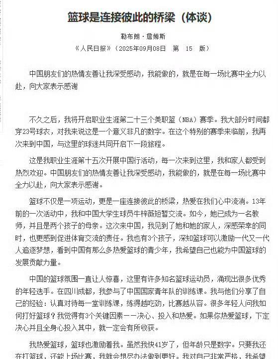 小黑子们气死了吧? 这不比321上链接强多了 詹姆斯在《人民日报》撰文 讲述篮球