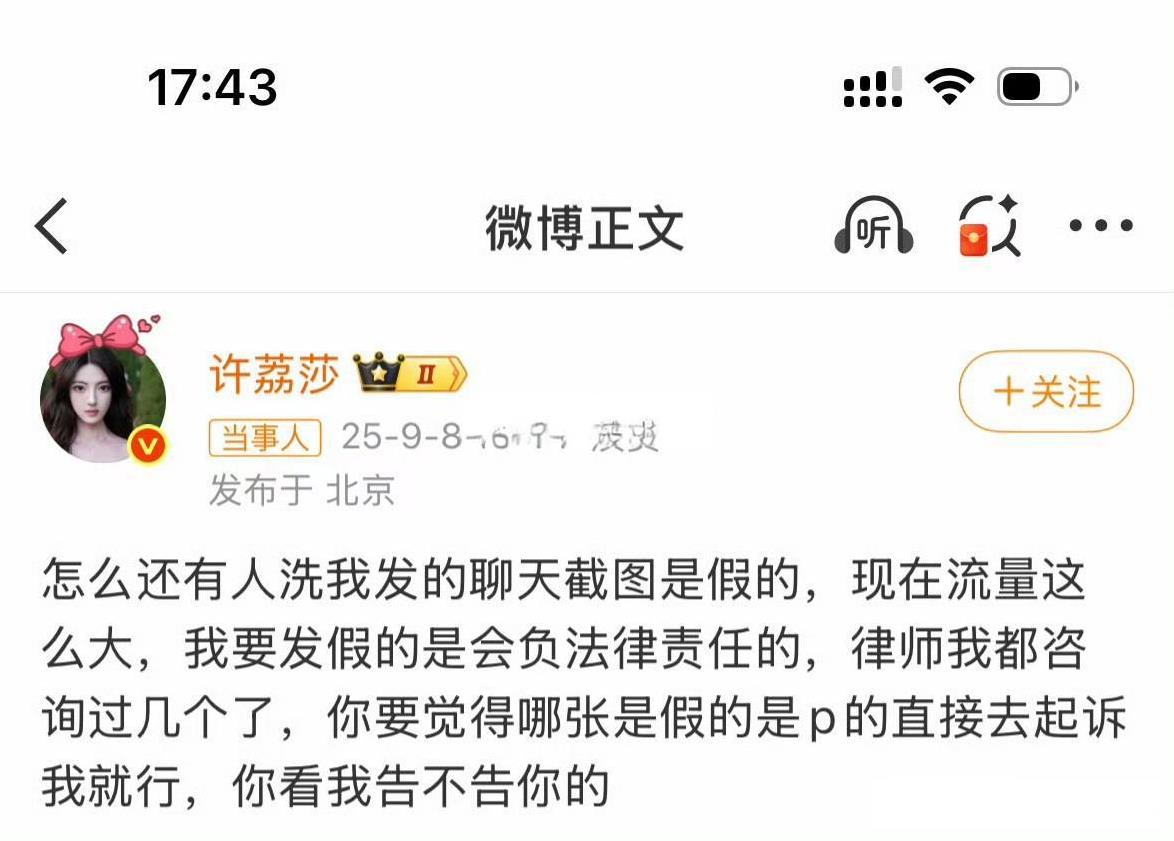 许凯赌博瓜越吃越大,许荔莎否认聊天截图是假的,她很刚地表示聊天截图就是真的。 看