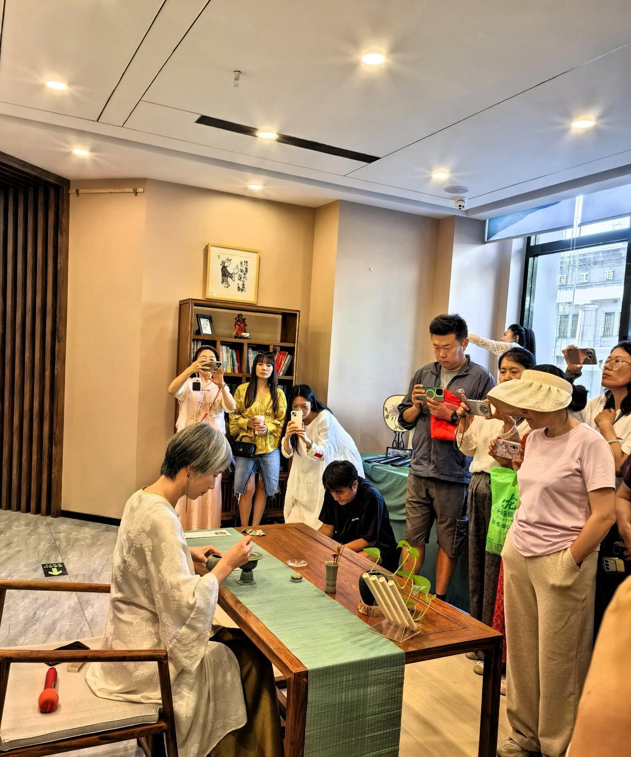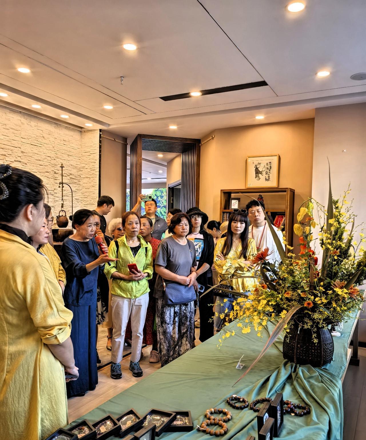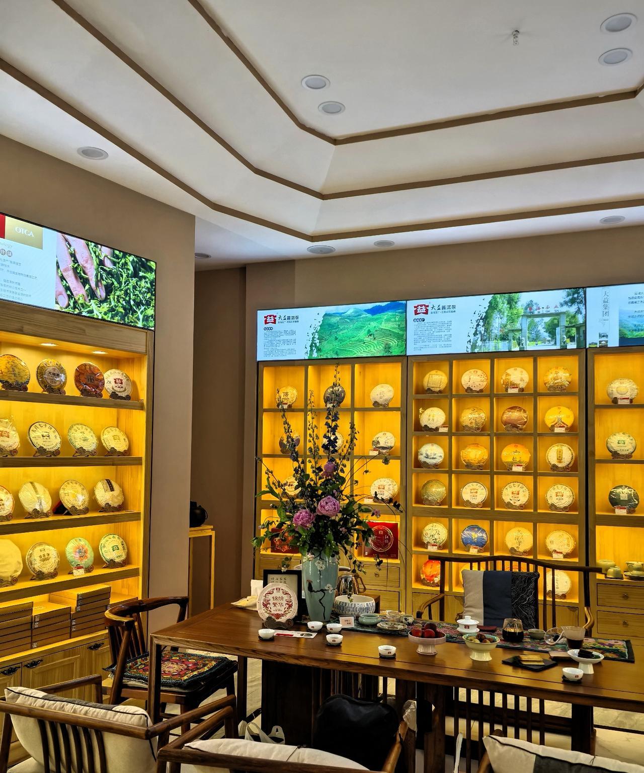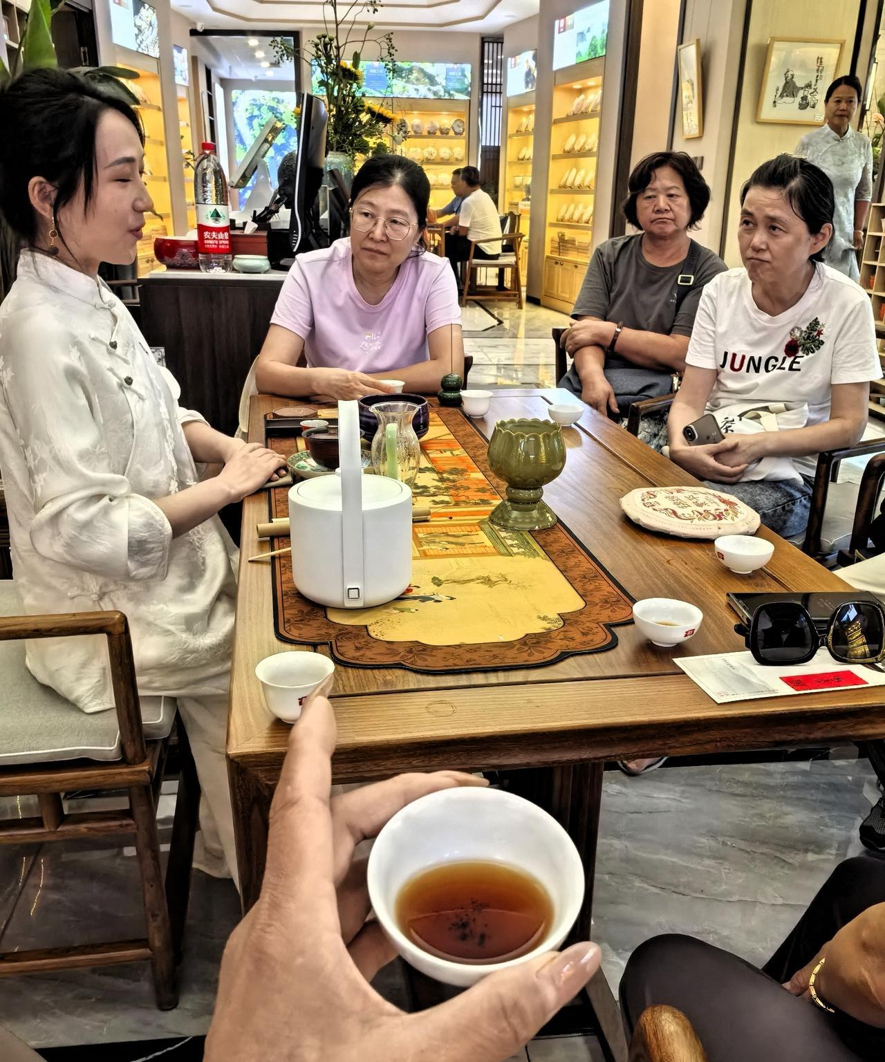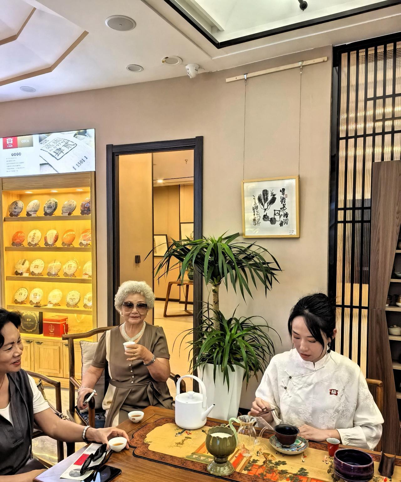 我这个人挺俗的,日常爱好不是火锅就是烧烤,其实也想接受点艺术熏陶。这不,去赏花品茶了,咱也风雅一把。 昨天下午好朋友提供了个机会,我领老妈去参加了一个叫做“大益美学 —— 禅韵花道秋季展”的活动,主要是赏花品茶。 特意穿上我的中国风小褂套装,我妈穿了一件拼色连衣裙,特意戴上她最喜欢的那一串珍珠项链。 说实话,我是个粗人,还是个急性子,平时鲜有耐心去培养插花、品茶这类高雅的爱好。有这个契机,正好去体验一下。 来到活动地点,刚进大厅就被惊艳到了!一大瓶插花映入眼帘,要不是淡淡的幽香沁人心脾,还以为是假花呢。 这里空间很大,拥有多间茶室,布置的古朴典雅,每一处细节都独具匠心,每一件茶具都像艺术品。周边墙柜上摆的全是各色的普洱茶饼,从一两百到三四千的都有。 人可真不少,女士居多。茶艺师们气质相当好,都穿着汉服或旗袍, 跟这个场景非常搭。 先是由来自台湾的插花老师给大家一一介绍插花的花语和技艺。 插花就是把枝叶、花朵通过修剪、构思和造型,在花瓶等容器中再度创作的一种艺术形式。 我们跟着老师的讲解,参观了室内风格各异的插花。一幅好的插花作品,能让室内瞬间提升格调与美感。不但带来视觉上的享受,心情也会变得愉悦。 参观完插花艺术,接下来就是品茶了。我们围坐在桌子旁,由美女茶艺师进行茶道表演。茶道,通俗来说就是品赏茶的美感之道。 先是点燃沉香,有一股淡淡的木质烟熏味。喝茶焚香目的是这些香型能与普洱茶的香气协调互补,营造宁静高雅的品饮氛围,使精神更好的放松。 然后开始泡茶。茶艺师动作那叫一个优雅,提壶、注水、奉茶,每个动作都展现出专业与从容,体现对茶的敬重。完美的展现了茶艺表演的“精、清、净、美”,原来喝茶这么有学问。 生普,如初见;熟普,似老友。三五好友闲来没事可以来这里喝喝茶,聊聊天,几十块钱一位,即可在普洱沉醉的茶香里,静享一下午的慢时光。 想想我平时喝茶,对容器根本不讲究,倒茶叶、泡上水、盖上盖就完活儿。在我看来茶道程序有点复杂或过于讲究仪式了,但了解了这么多茶文化的知识,还是觉得受益良多。 喝茶有益健康,延缓衰老;茶道更利于修身养性、陶冶情操。有这么多好处,我都想回家弄个茶台比划比划了。[呲牙]