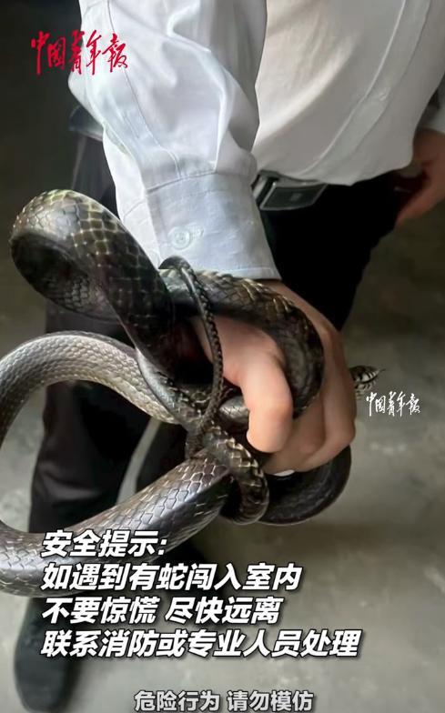 “胆子真大!”近日,广西钦州,一男子发现有条大黑蛇溜进了小区,担心有人被蛇咬伤,就急忙联系了小区保安,保安赶到后非常淡定,赤手空拳就将大蛇抓获,随后带到远一些的地方放生了。网友:又是别人家的保安! 蛇类属于变温动物,身体温度会随着气温的变化而变化,尤其在夏天会变得异常活跃,这个时候南方人就要小心了,不仅在外面能够遇到蛇,有时在家中都会被吓一跳! 据媒体9月8日的报道,男子回家时,看到一条1米多长的大黑蛇闯进了小区,不确定这条蛇有没有毒,男子并没有过去驱赶,急忙联系了小区保安。 保安接到电话后立即赶往门厅,经过辨认,这是一条无毒蛇,随后他轻车熟路的上前,用脚踩住蛇头后,蛇迅速缠绕在了他的腿上。 保安不慌也不忙,捏住蛇尾慢慢“解开”,随后掐住蛇头,在众人的注视下,将蛇带到了远一些的地方放生了。 广西的毒蛇种类较多,现在又是蛇类活跃的时候,因此在户外遇到蛇后,一定不要擅自捕捉,正确的做法是远离它们,一般人不招惹蛇,蛇也不会主动攻击人。 要是家里进了蛇,应尽量将蛇限制起来,然后拨打消防电话,让专业的人员上门来抓蛇。 信息来源:《一条蛇闯入小区门厅,保安迅速赶到徒手将其抓捕后放生。》中国青年报