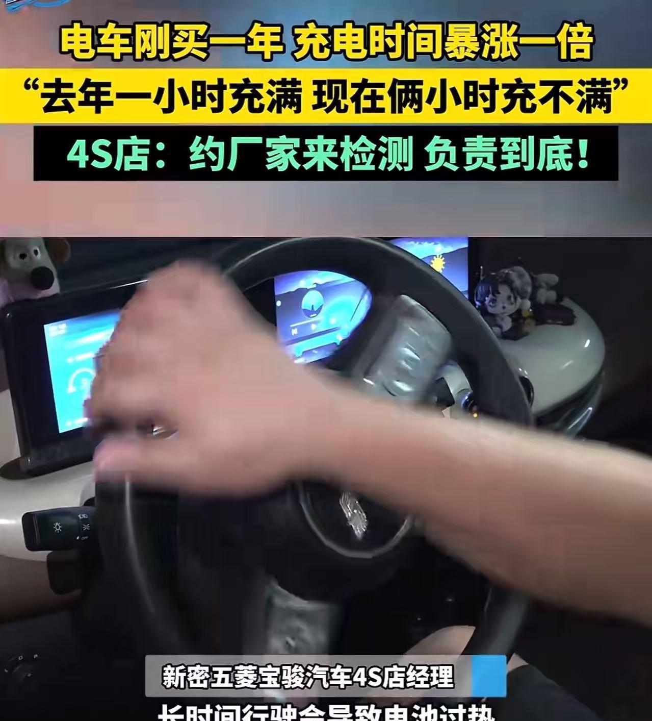 河南新密,男子开着新车带妻子孩子去旅游,600公里跑13 个小时,结果7个小时都在充电!男子受不了,觉得电池快充有问题, 于是向4S 店反映,可人家睁眼说瞎话,非说这是正常的……男子:“之前都只用一个小时,现在2个多小时都没充满,明显不正常!” (来源:河南都市频道) “相当糟心,相当生气,我开车在路上跑的时间,还没充电的时间长呢,这一路上得浪费我多少宝贵的时间啊!”一见到调解员,郭先生就满脸愤怒,忍不住大倒苦水。 去年九月份,郭先生想着现在油价那么高,电车能省不少油钱,而且购车还有补贴,于是,他把老的油车置换,购买了一辆全新的五菱宾果电车。 他满心期待着这辆车能给自己带来便捷又经济的出行体验。可是这车虽然在油钱上给他省了一些,但开下来之后,却让他烦闷不已! 8月底,郭先生想着暑假都快结束了,得抓住这最后的机会,带着妻子和孩子出去旅游一趟,好好放松放松。 要是开油车的话,几个小时就能轻松开到目的地。可他这辆电车呢,一路上状况百出,整整开了13个小时才到。 这电车的问题首先就出在电池上。它的电池容量实在太小了,只有30度电,开了还不到200公里,郭先生就得进服务区去充电。 而且这充电时间也越来越离谱,刚买车那会儿,充电一个小时左右就能充到30度电,可现在倒好,都过去2个半小时了,还没充满呢。 本来充电速度就慢得让人着急,郭先生更不敢待在车里开空调充电了,只能让老婆在旁边坐着等。 可天气热得像个大火炉,老婆和孩子在旁边等得直喊受不了,一个个汗流浃背,满脸的烦躁。 原本预计几个小时就能轻松到达的路程,硬生生被拉长到了13个小时。等他们终于到达目的地的时候,已经是深夜了。 孩子早就累得在车里呼呼大睡,小脸儿上还带着未消的疲惫;妻子也是一脸的倦容,整个人都疲惫不堪。 郭先生看着家人劳累的模样,再想想这一路上遭遇的种种折腾,心里的火气“噌”地一下就上来了,满心的委屈和愤怒。 第二天,郭先生就赶紧联系了买车的车店,他想着买车的时候,销售可是信誓旦旦地承诺这款车的电池终身质保呢,所以他就要求4S店给自己解决问题,不管是换电池还是采取其他什么措施,总得把这事儿解决好。 可是让郭先生万万没想到的是,4S店的态度却让他气愤不已。他们居然轻描淡写地说车没有任何问题,这充电速度是正常的。郭先生一听,这哪能正常啊?充满时间都增加了一倍,这还能叫正常? 而且郭先生的朋友和他一起出发,人家那辆电车四五十分钟就充满了。 郭先生的朋友还忍不住吐槽说:“我车买的比他时间还长呢,结果比他充得快多了。他是30度的电池,我是70度的,我一个小时就充满了,他倒好,充了三个小时,这车质量也太差劲了吧!” 郭先生也跟着附和道:“这车电池根本就不中用啊,我要是成天在高速上充这么久,那我以后还咋开车出门啊?这根本就没法正常使用嘛!” 于是,调解员陪着郭先生来到了4S店。经理解释说:“因为它这款车是属于低配的,电池不是水冷的,是风冷的。高速上电池长时间行驶会导致电池过热,快充的话它会受限制,需要等电池包降过温了以后才可以正常快充。” 可是郭先生对这个说法并不认可,他说:“我去年跑了一天高速,一天也充了三四次电,都是正常快充啊,怎么现在就不行了呢?” 经理便问道:“你当时去年是几月份?” 郭先生回答说:“十月份。” 经理接着说:“十月份跟七八月份的天气可不一样啊,我们只能帮你向厂家反馈,需要他们派人来检测电池,如果报告出来有问题,保证给予维修……” 此事引发热议,有网友说,老百姓真不适合买电车!哪有时间天天闲的没事充电玩!尤其是经常出去几百公里打工的! 也有网友说,现在电车都是快充的,说白了就是他的车太便宜了,车子垃圾,买个20几万的电车试试! 还有网友说,这就是代步的老年车,一个开市区的车拿去跑长途,还要跑600公里,这个结果也不奇怪。 在我看来,4S店这种推诿责任、轻描淡写的处理方式实在是不妥。消费者购买产品,就是基于对品牌和销售的信任,当产品出现问题时,4S店理应积极解决问题,而不是找各种借口来搪塞。 郭先生作为消费者,有权要求得到合理的解决方案,毕竟他花费了金钱和时间,却得到了如此糟糕的体验。 如果4S店继续这样不作为,不仅会失去郭先生这个客户,更会损害品牌在消费者心中的形象,长此以往,谁还敢放心购买他们的产品呢?