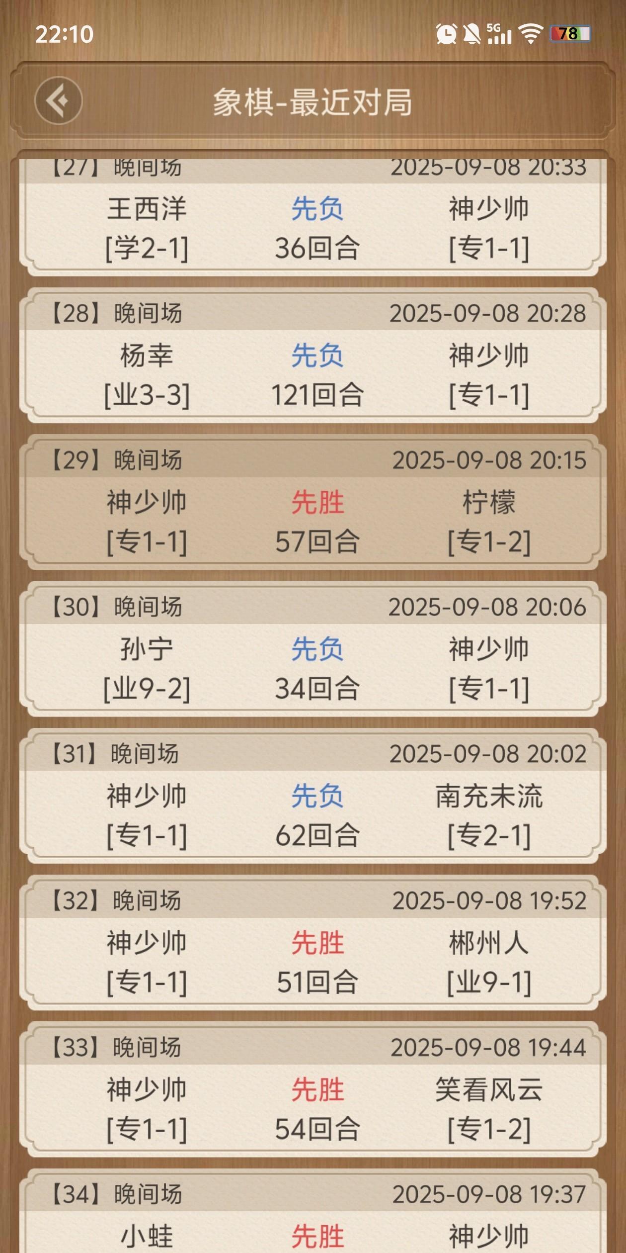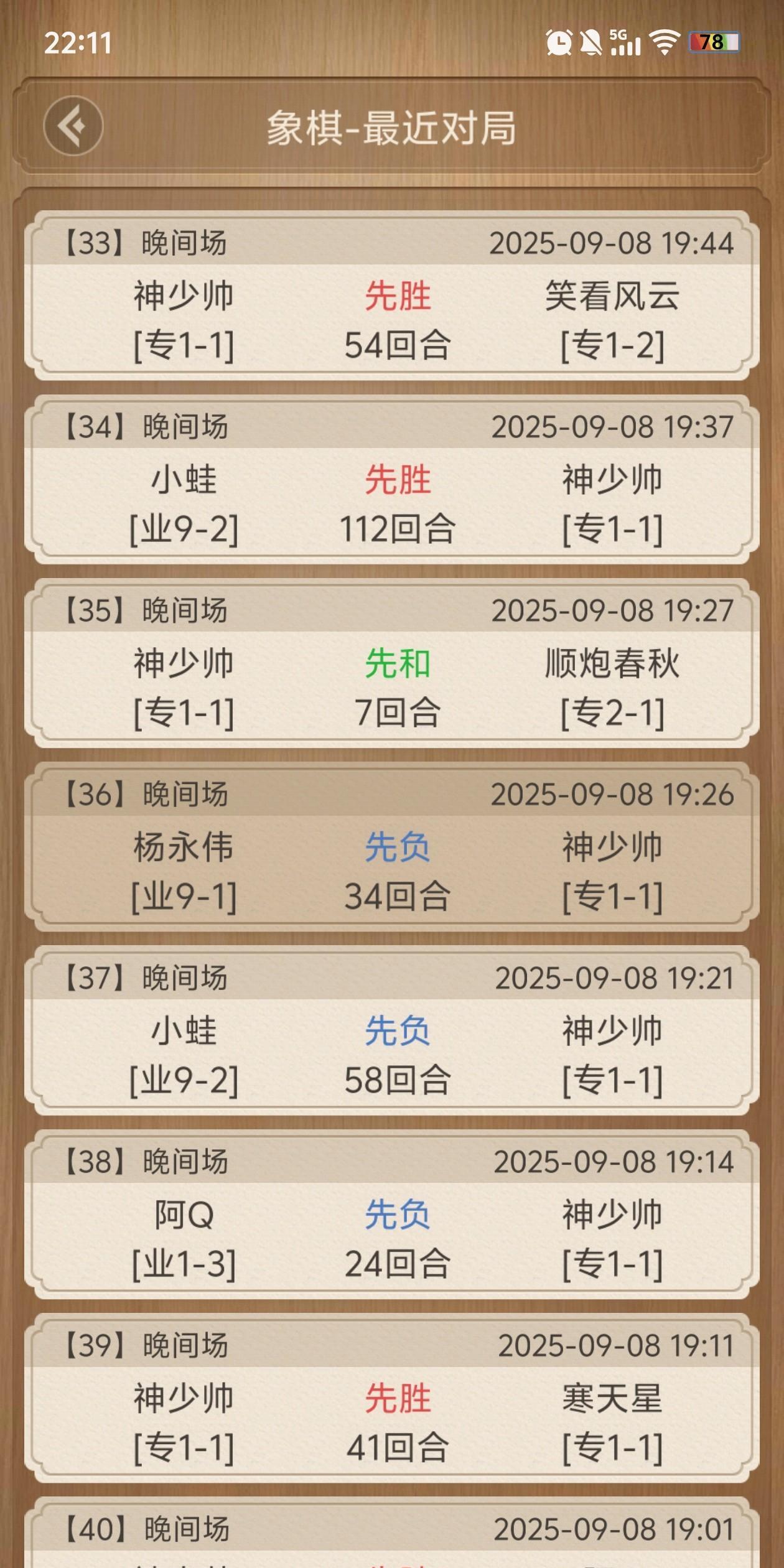 2025棋王赛第50场,神少帅惊险夺亚军! 战况: 今晚23胜12平5负!太难了,只有冠军稳如老狗,28胜,其他人都是20胜左右,高手相遇,一不留神就翻车,加上晚上没状态,赛程过半,还排在后边,反应迟钝,下的相当慢,最后一刻,犹如神助,晚一秒匹配不上,就第三,杀完最后一盘,逆袭第二,成为亚军,你就说难不难吧? 小结: 输的5盘棋,一盘输软件,两盘优势漏了,一盘中套路,一盘优势没时间了,输在时间! 今天这状态,冠军就别想了,下完了,还一脸懵逼,脑袋晕晕乎乎的!明天再说玩吧,好好休息,恢复一下精气神,再战! #头号创作者激励计划#