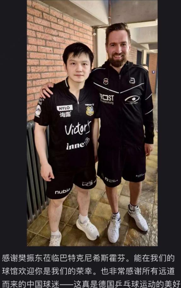 昨天,巴特克尼希斯霍芬德甲乒乓球俱乐部经理发了一张和樊振东的合照并配文:感谢樊振
