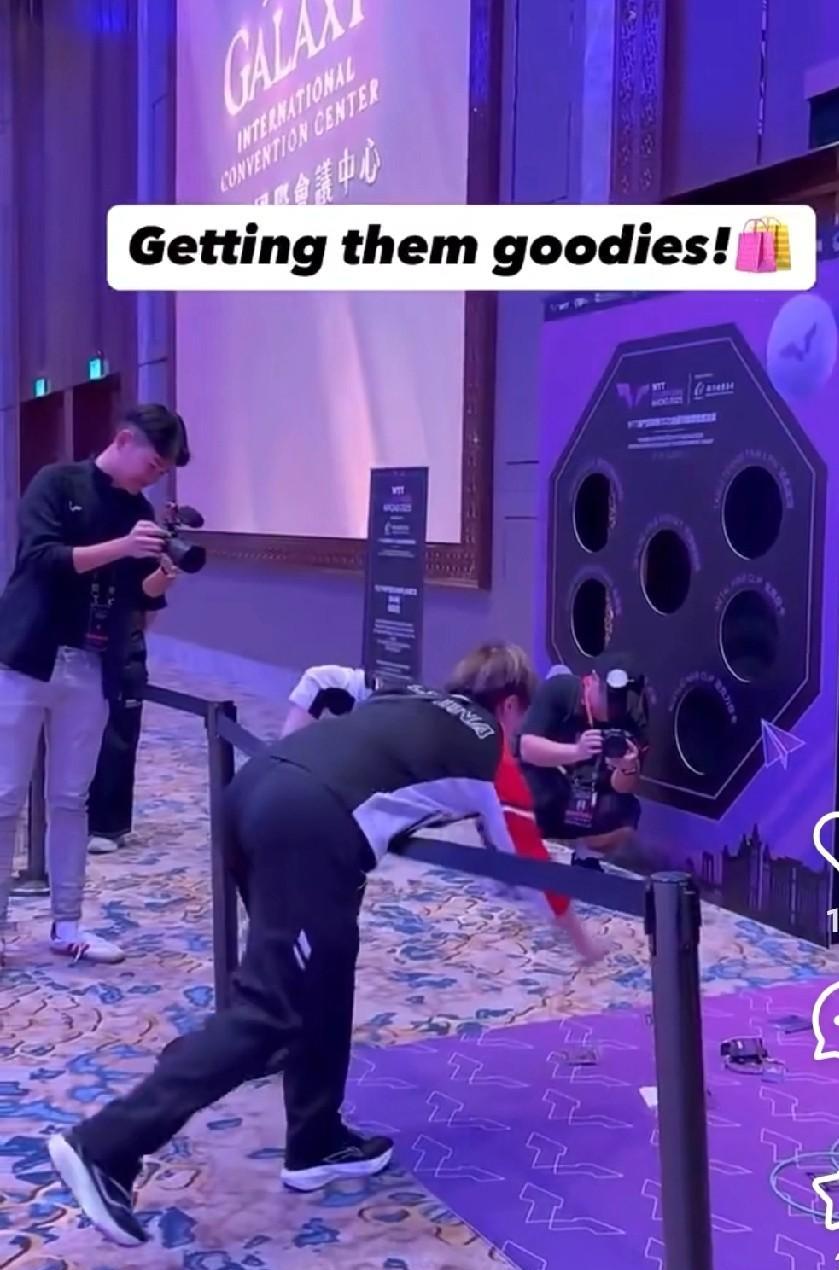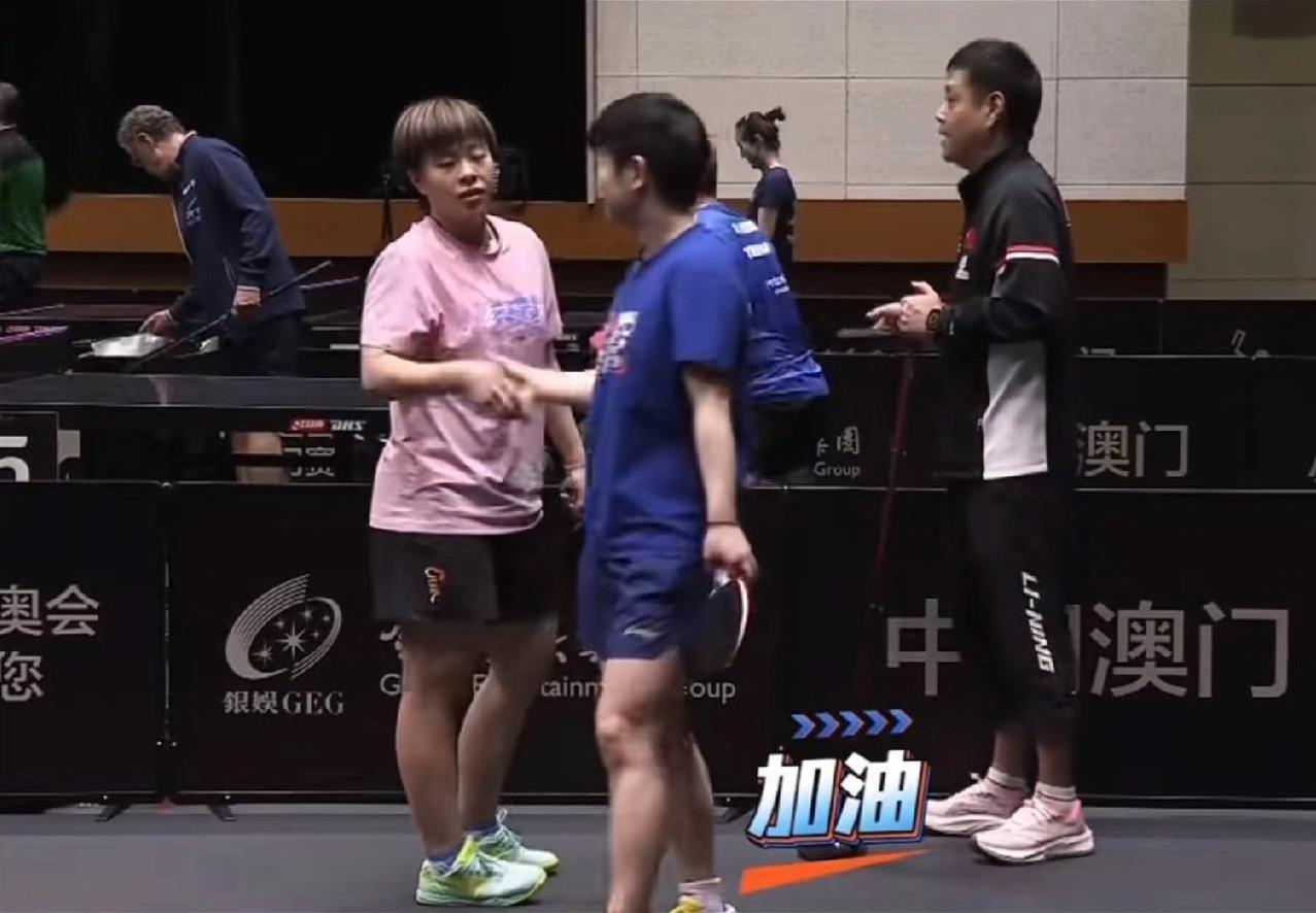莎莎又被球攻击到手了。 今天下午国乒去训练馆训练,莎莎和大迪对练,王曼昱和陈幸同对练,大迪穿一件粉色衣服也挺好看呢,大迪练球时劲儿也很大,一个球过去后,打打到莎莎手上又弹到鼻尖了,疼得莎莎叫了,还揉揉小手。对练结束后,莎莎和大迪不是击掌,而是握手,大迪握手也很用力,确实是一身使不完的劲儿啊。 上午因为天气的原因,大家都没去训练,明天比赛就开始了,所以都训练到很晚。回到酒店直接去参加晚宴了,国乒女队都穿着队服去了,大迪还很开心的去玩了套圈,看大迪半个身子都进去了,套到一个小包包,哈哈。 今天晚上吃好喝好玩好,回去好好休息,明天好好比赛。王艺迪明天有比赛,看到大迪状态很好,加油哦!