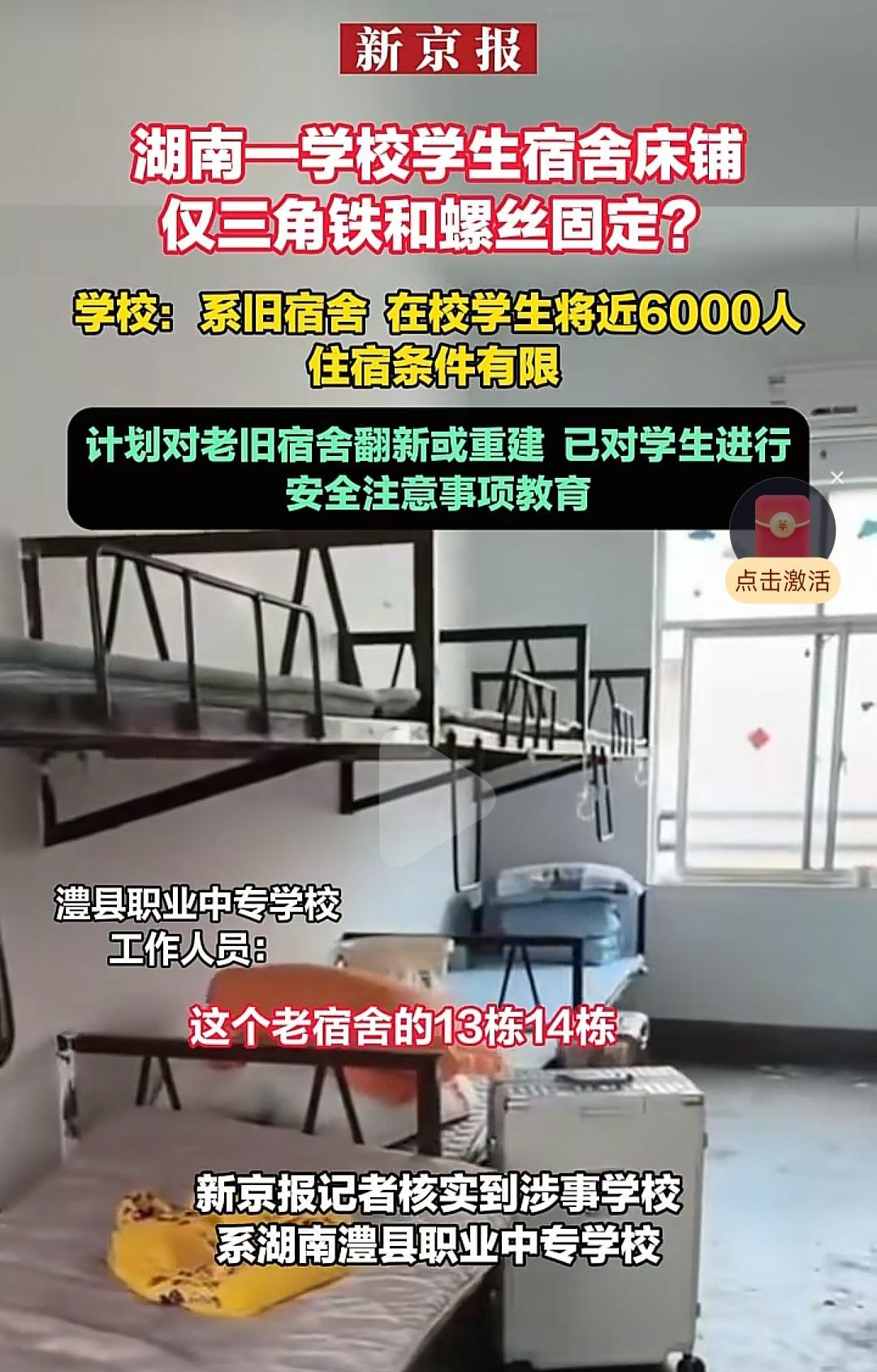 简直如赌徒!湖南一职校的宿舍床铺仅用三角铁和螺丝固定,简单得吓人,人多条件有限不是借口,万一有事就是大事,谁也赌不起。 近日,有家长反映湖南澧县职业中专学校宿舍的床仅用三角铁和螺丝固定,看上去非常不稳。 经记者核实确实如此,校方称,在校生将近6000人,场地有限,人数又多,不得已才启用了两栋旧宿舍,学校也承认存在安全风险,计划翻新或重建,已经提醒学生和宿管员注意上下铺安全。 不解释则己,一解释感觉更危险,不仅宿舍楼老得需翻建,那三角架还不知道是猴年马月装的,真担心体重胖的孩子是否能承受,万一孩子在床上打闹怎么办? 当下是应该消除隐患,而不是等计划。说学校没钱估计很多人不信,作为公办学校,国家都有教育经费的,实际的困难当地财政也应该出面解决,再苦也不能苦了孩子。 生源突破了,也创造了效益,买新的床铺又花得了多少钱呢? 湖南澧县中职学校并非个例,近段时间曝学生生活环境差的不在少数,有的单位用国家的钱修大门,动则几十万,上百万的,修学校宿舍就没钱。 孩子是一个家的未来,国家的未来,不能拿这种赌徒心态,牺牲学生的安全来博明天,教训会很惨痛。 希望孩子们有个好的学习环境,每个孩子能茁壮成长,也希望搞教育要办实事,不要只是空喊口号,总等家长去发现问题。