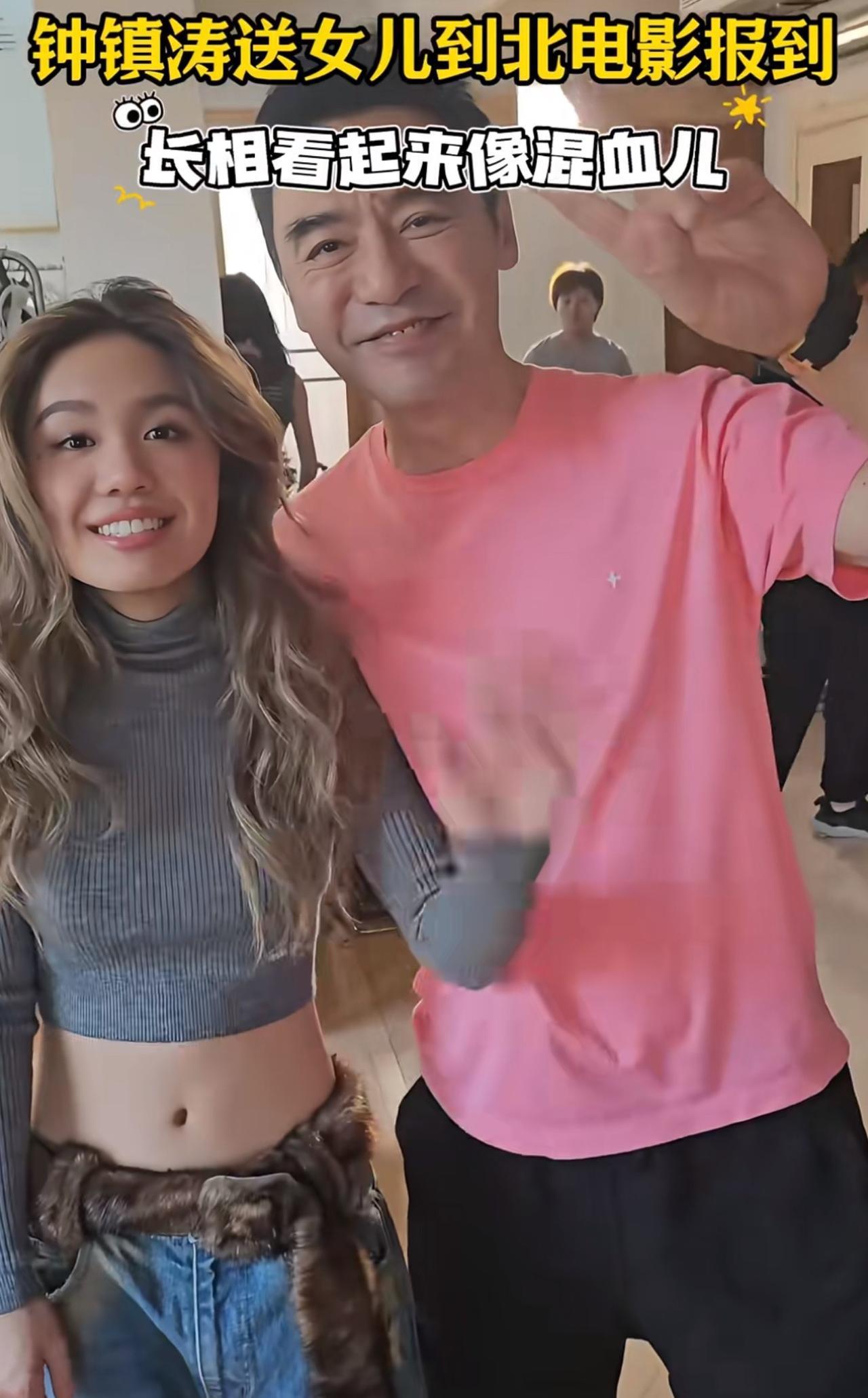 钟镇涛带女儿到学校报到,长相好似混血儿。钟镇涛带女儿钟懿去北电影报到,一头金黄色