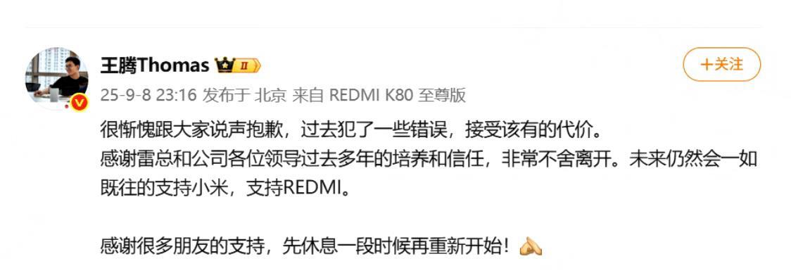 小米逆天大事件,中国区市场部总经理兼Redmi品牌总经理王腾深夜被辞退! 王腾作为小米10年老臣和知名度较高的小米高管,自16年加入小米任产品总监,到24年初接替卢伟冰升任Redmi品牌总经理,再到24年底晋升为小米中国区市场部总经理,同时保留Redmi品牌总经理职位,绝对算得上是小米集团的核心高管。 根据小米的深夜公告和王腾的深夜道歉,只知道因“泄露公司机密信息” 以及 “存在利益冲突等严重违规违纪行为” 被辞退,并没详细道出王腾到底何时犯了何具体错误。 但这个消息确实够逆天……