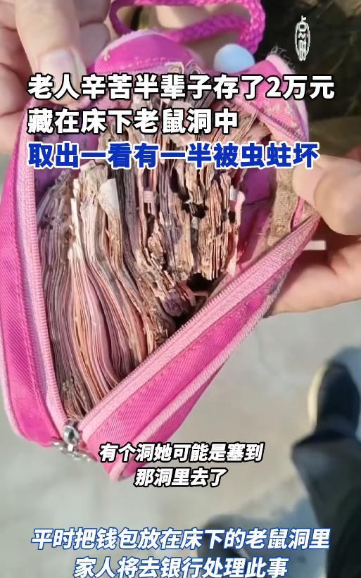 这下后悔了吧!9月6日,河南信阳,一老太意外摔伤急用钱看病,子女将她送往医院后,老太才告诉孩子床下藏了2万块钱!儿子回家寻找后,果然在老鼠里找到了钱包,可是打开一看,有一半多的钱都被虫子咬了,最后到医院只换了5000多。网友:存在银行该多好! 现在手机支付已经很方便了,但上了年纪的老人不会用智能机,他们还是习惯用现金,平日里攒下的钱也多以现金的方式储存,然而,这样不仅容易丢失,而且还会受潮、被虫蛀。 这天,老太太走路时不慎摔倒,儿女发现后急忙将其送去医院,拍片子检查后发现老太摔得不轻,医疗费挺贵的。 在这用钱关头,老太太表示,自己攒了半辈子的钱都放在床下的洞里了,于是儿子就回家寻找,果然在床下的老鼠洞里发现了一个钱包。 摸起来厚厚一沓钱,可打开后,儿子却傻眼了,由于洞内潮湿,导致生了虫子,一半多的钱都被虫子给咬坏了! 最终,儿子带着破损的钱去银行兑换,结果只换了五六千块钱,老人得知后也是后悔莫及。 所以咱们平时一定要妥善保管好现金,要放在干燥的环境下,放在没有虫子、老鼠的地方,同时尽量不要在家中存放大量现金。 信息来源:《老人床下老鼠洞藏2万元一半被虫蛀》点时新闻