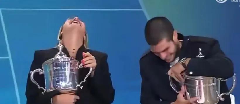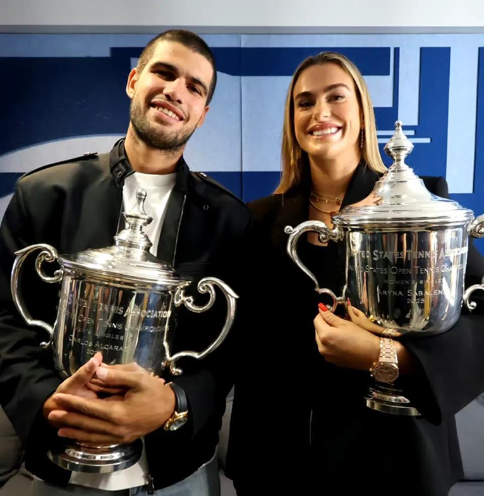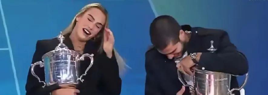 萨巴伦卡竟然“朱丹附体”,将阿尔卡拉斯说成辛纳。 美网两位冠军得主萨巴伦卡和阿尔