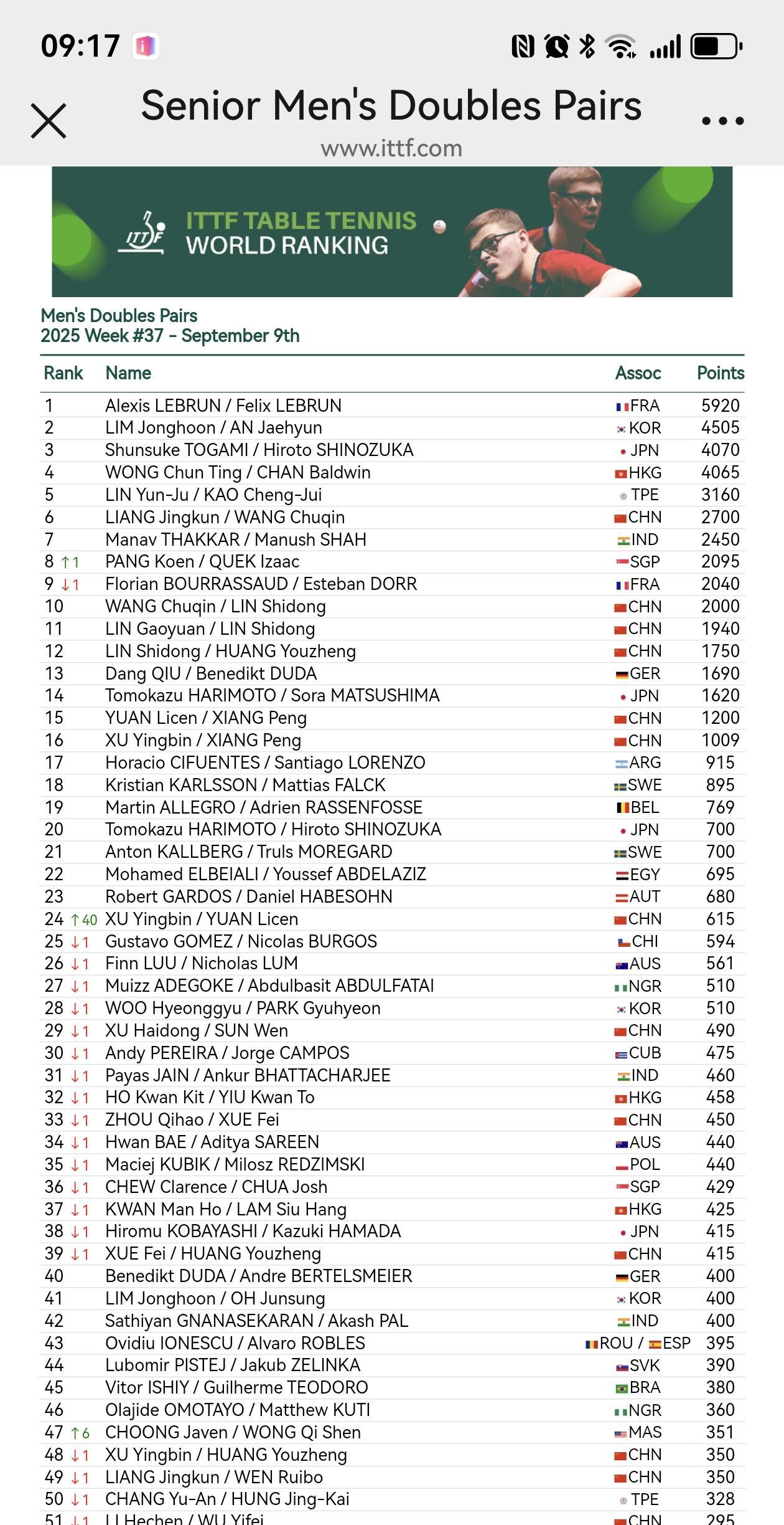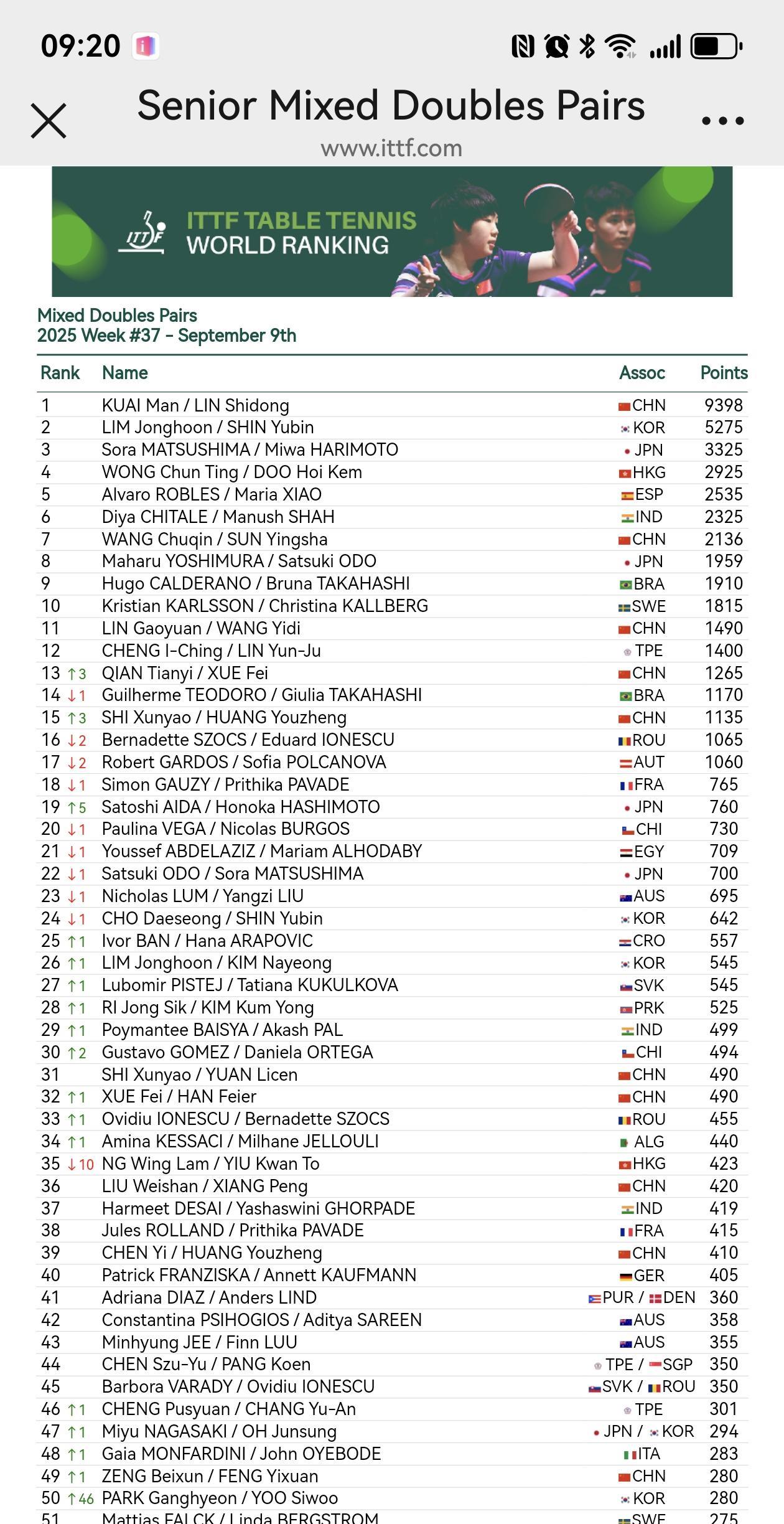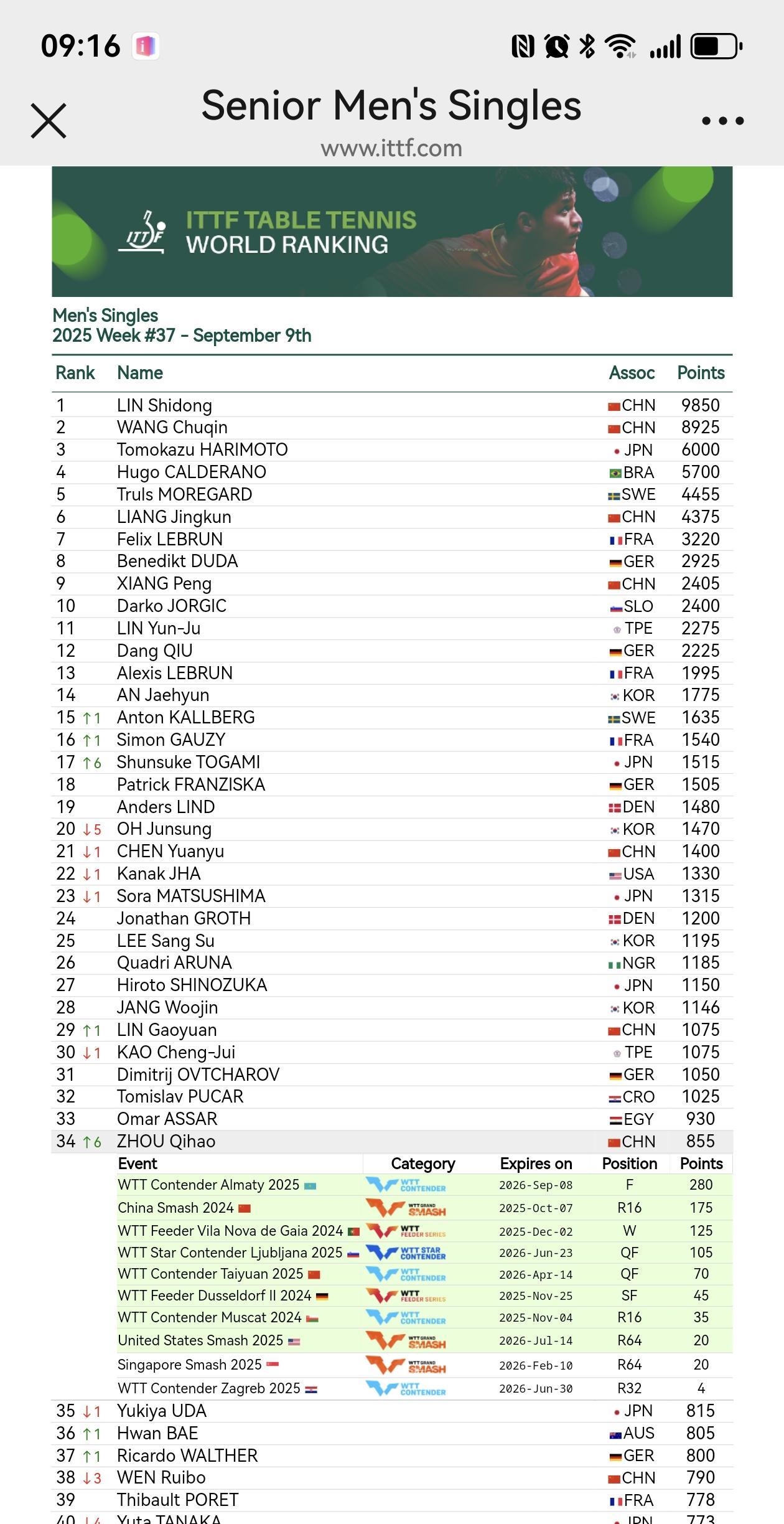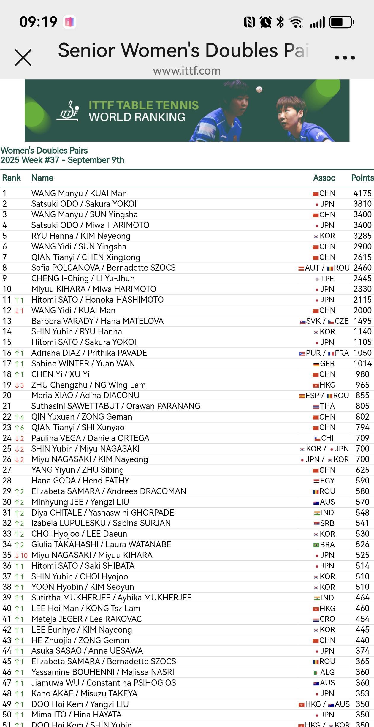 ITTF2025第37周世界排名官宣: 女单,陈熠落后一位,第九;桥本帆乃香晋级
