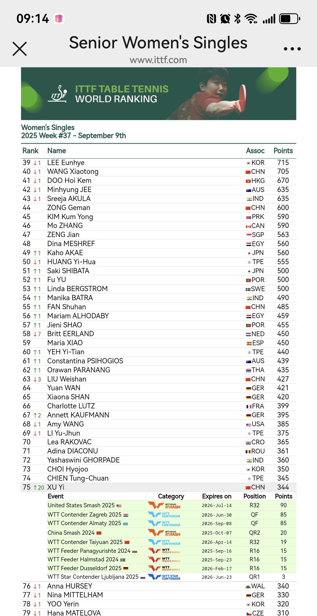 ITTF2025第37周世界排名官宣: 女单,陈熠落后一位,第九;桥本帆乃香晋级第11,石洵瑶落后一位第12。进步最快的是覃予萱,进入到第31,晋级12位,已经具有参加冠军赛资格,仅仅看参赛名额了呢。徐奕第75,晋级了20位。女双晋级最快的,纵歌曼/覃予萱!几位女乒小将积分有所提升呵呵。