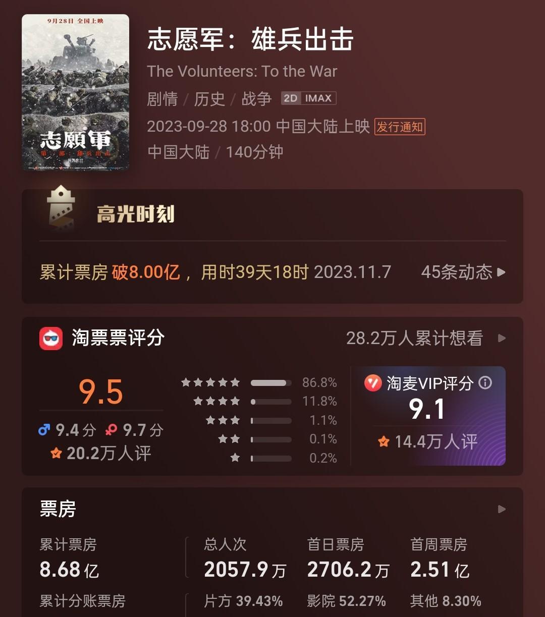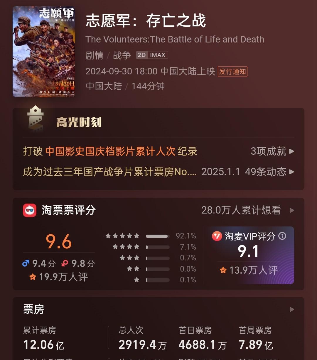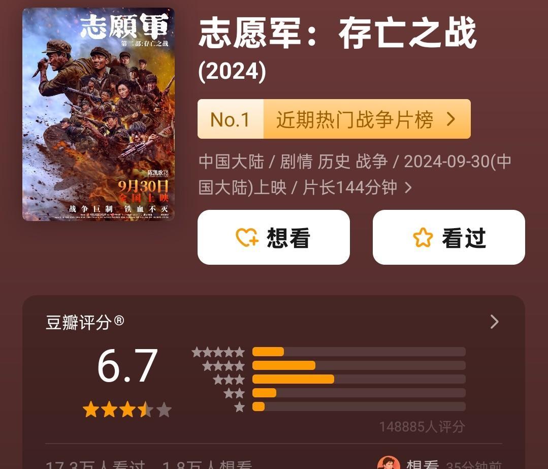 《志愿军3》官宣定档国庆上映,这是这个系列的收官之作。 第一部口碑6.9分,票房