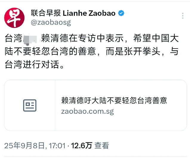 外媒9月8日报道:“赖清德在专访中表示,希望中国大陆不要轻忽台湾的善意,而是张开拳头,与台湾进行对话。”