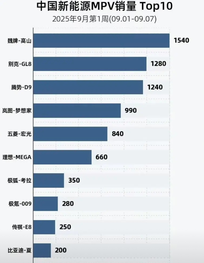 孙少军:MPV销量榜单,上周高山1540台排第一。