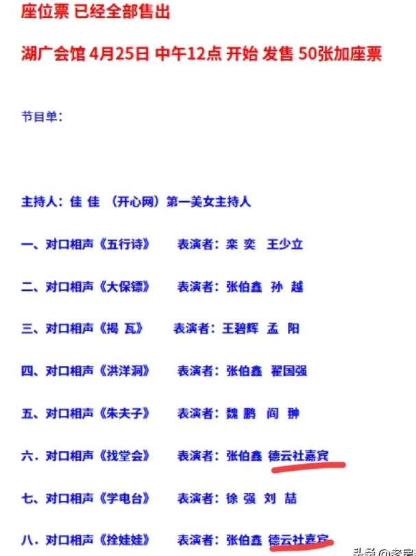 有细心网友找到了09年德云社演员给张博鑫的艺馨社助演的节目单,最后攒底的节目就是刘喆说的张博鑫都没有上山就下来的栓娃娃。